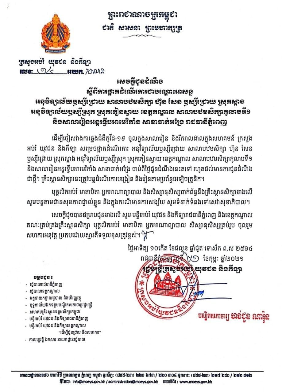 យោងតាមសេចលកដីជូនដំណឹងរបស់ក្រសួងអប់រំនៅថ្ងៃទី២១កុម្ភៈឆ្នាំ២០២១ បានឲ្យដឹងថា ដើម្បីចៀសវាងការឆ្លងជំងឺកូវីដ-១៩ចូលក្នុងសាលារៀន និងរីករាលដាលក្នុងសហគមន៍ ក្រសួងបានសម្រេចផ្អាកដំណើរការ អនុវិទ្យាល័យឬស្សីជ្រោយ, សាលាបឋមសិក្សា ហ៊ុន សែន ឬស្សីជ្រោយ ស្រុកស្អាង ខេត្តកណ្ដា, អនុវិទ្យាល័យឬស្សសីស្រុក ស្រុកកៀនស្វាយ ខេត្តកណ្ដាល, សាលាបឋមសិក្សាកូលាបទី១ និងសាលាអន្តរទ្វីបអាមេរិកាំង សាខាចាក់អង្រែ ចាប់ពីថ្ងៃ២១កុម្ភៈតទៅរហូតដល់មានការជូនដំណឹងជាថ្មី។ ក្រសួងក៏បានបញ្ជាក់ថា គ្រឹះស្ថានសិក្សាទាំងនោះ ត្រូវដំណើរការបង្រៀន និងរៀនតាមប្រពន្ធ័អេឡិចត្រូនិក។ ជាមួយគ្នានោះ ក្រសួងអប់រំក៏បានណែនាំឲ្យបុគ្គលិកអប់រំ មាតាបិតា អ្នកអាណាព្យាបាល និងសិស្សានុសិស្សពាក់ពន្ធ័នឹងគ្រឹះស្ថានសិក្សាទាំងនោះ ត្រូវបន្តតាមដានសុខភាពផ្ទាល់ខ្លួន និងក្នុងករណីមានការសង្ស័យ ត្រូវទំនាក់ទំនងទៅសេវាសុខាភិបាល។ កម្ពុជាទើបនឹងរកឃើញករណីផ្ទុះក្នុងសហគមន៍ជាលើកទី៣នៅថ្ងៃទី២០កុម្ភៈឆ្នាំ២០២១។ ក្នុងរយៈពេល៣ថ្ងៃចាប់ពីថ្ងៃទី២០ដល់ថ្ងៃ២២កុម្ភៈនេះ នៃសព្រឹត្តិការណ៍សហគមន៍២០កុម្ភៈចំនួន៧៦នាក់ហើយ។
