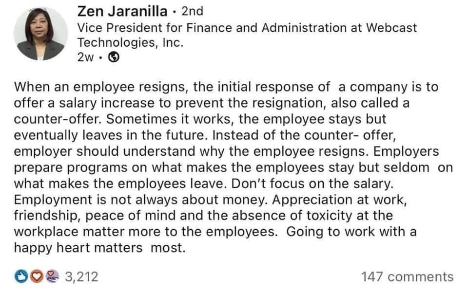 ការងារមិនមែនមើលតែរឿងលុុយមួយមុខទេ។ ការលើកទឹកចិត្ត មិត្តភាព សុខមាលភាពផ្លូវចិត្ត និងបរិយាកាសធ្វើការល្អ ជារឿងសំខាន់សំរាប់បុគ្គលិក ហើយអ្វីដែលសំខាន់ជាងគេបំផុតគឺ “ការបំពេញការងារដោយក្តីរីករាយ”។