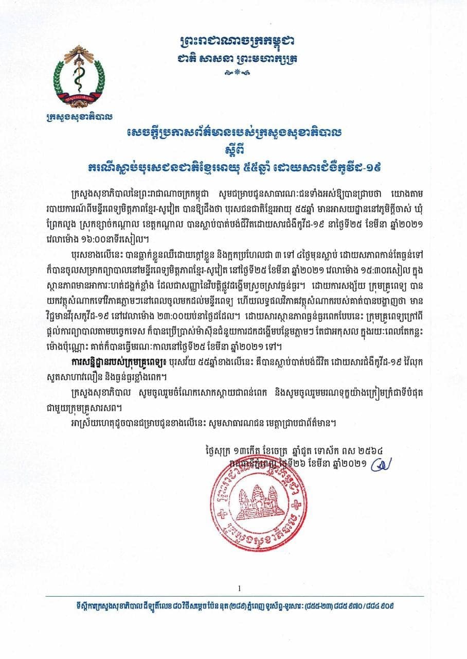 ក្រសួងប្រកាសផ្លូវការ ករណីស្លាប់គឺដោយសារមេរោគកូវីដ១៩ វាលលុកសួតលឿន និងធ្ងន់ធ្ងរពេកOne-Minuteអត្ថបទដោយ៖AMS OneMinute AMS OneMinuteអត្ថបទមុនអត្ថបទបន្ទាប់