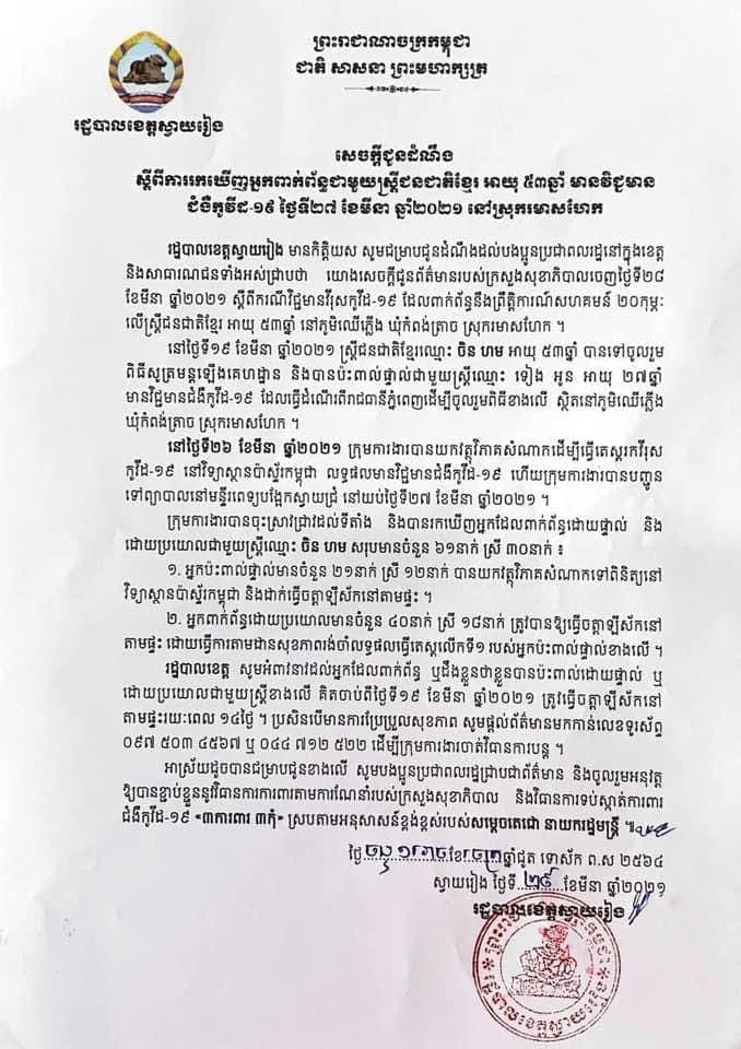 មនុស្ស ៦១នាក់ពាក់ព័ន្ធជាមួយស្រ្តីជនជាតិខ្មែរ អាយុ ៥៣ឆ្នាំ មានវិជ្ជមានជំងឺកូវីដ១៩ ថ្ងៃទី២៧ មីនា២០២១ នៅស្រុករមាសហែកOne-Minuteអត្ថបទដោយ៖AMS OneMinute ប្រភព៖ រដ្ឋបាលខេត្តស្វាយរៀង AMS OneMinuteអត្ថបទមុនអត្ថបទបន្ទាប់