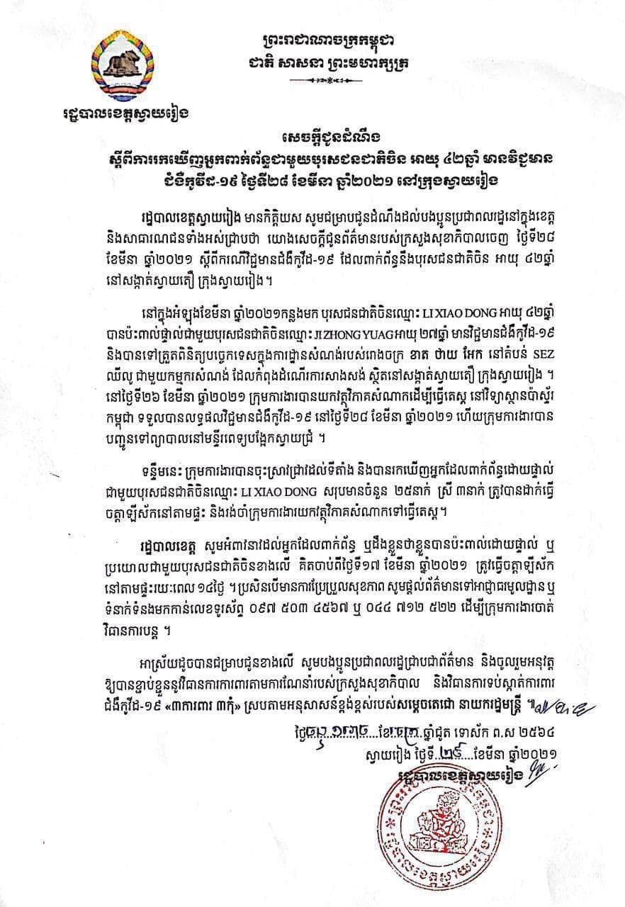 រដ្ឋបាលខេត្តស្វាយរៀងប្រកាសរកឃើញអ្នកដែលពាក់ព័ន្ធដោយផ្ទាល់ ជាមួយបុរសជនជាតិចិនឈ្មោះ LI XIAO DONG អាយុ៤២ឆ្នាំ ដែលមានផ្ទុកវិជ្ជមានជំងឺកូវីដ១៩ សរុបចំនួន២៥នាក់One-Minuteអត្ថបទដោយ៖AMS OneMinute ប្រភព៖ រដ្ឋបាលខេត្តស្វាយរៀង AMS OneMinuteអត្ថបទមុនអត្ថបទបន្ទាប់