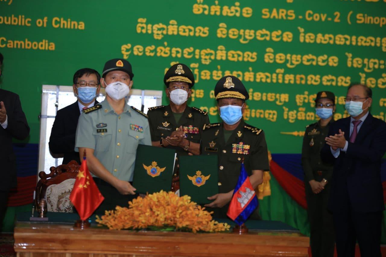 សម្តេចពិជ័យសេនា ទៀ បាញ់ ឧបនាយករដ្ឋមន្ត្រី រដ្ឋមន្ត្រីក្រសួងការពារជាតិ តំណាងរបស់សម្តេចតេជោ ហ៊ុន សែន នាយករដ្ឋមន្ត្រីកម្ពុជា ទទួលវ៉ាក់សាំង ខណៈឯកឧត្តម វ៉ាង វិនធាន ឯកអគ្គរដ្ឋទូតចិនប្រចាំនៅកម្ពុជា តំណាងឱ្យរដ្ឋាភិបាលចិន បានប្រគល់វ៉ាក់សាំងនេះជូនរួចរាល់ហើយ។