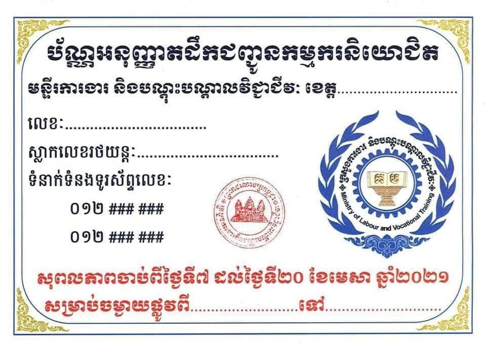 ក្រសួងការងារ ចេញសេចក្តីជូនដំណឹងស្តីពីប័ណ្ណអនុញ្ញាតិដឹកកម្មករនិយោជិតក្នុងអំឡុងពេលដាក់កំហិតលើការធ្វើដំណើរក្នុងប្រទេស