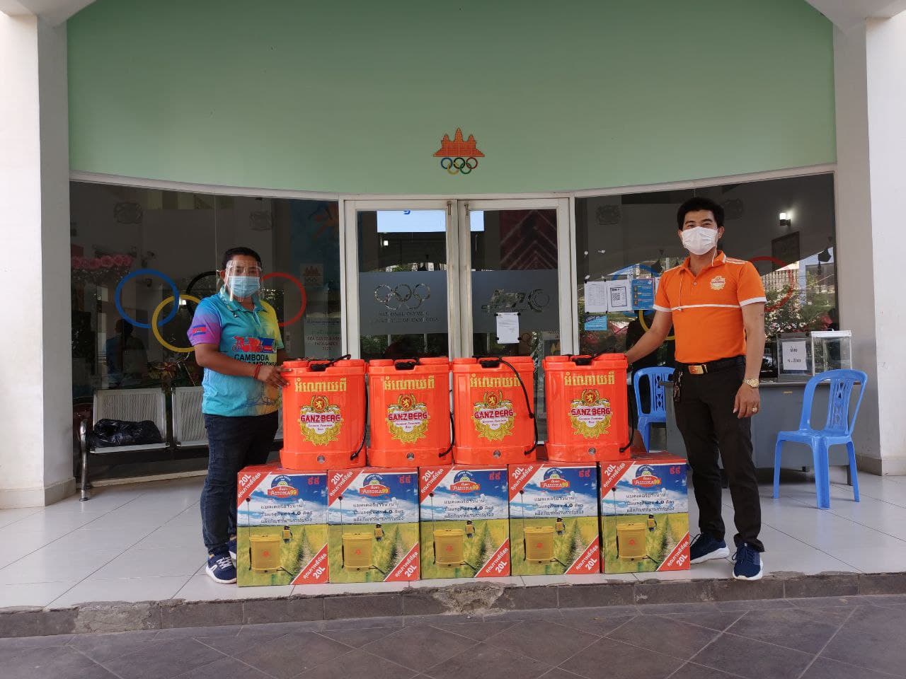 ម៉ាស៊ីនបាញ់ថ្នាំសម្លាប់មេរោគចំនួន២០គ្រឿង ត្រូវបានក្រុមហ៊ុនស្រាបៀរហ្គេនស៍បឺត ឧបត្ថម្ភ តាមរយៈកញ្ញា មាស តឿ អគ្គហិរញ្ញឹក សហព័ន្ធកីឡាទូកកានូ និងរ៉ូអ៊ីងកម្ពុជា នាព្រឹកថ្ងៃទី០៦ ខែមេសា ឆ្នាំ២០២១ម្សិលមិញនេះ ។