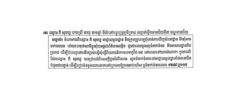 រដ្ឋបាលរាជធានីភ្នំពេញ អំពាវនាវឲ្យអ្នកជំងឺកូវីដឈ្មោះ វ៉ា សុខហួ និងអ្នកដែលស្គាល់គាត់ ជួយរាយការណ៍មកមន្ដ្រីសុខាភិបាល ក្រោយទំនាក់ទំនង និងស្វែងរកមិនទាន់ឃើញ