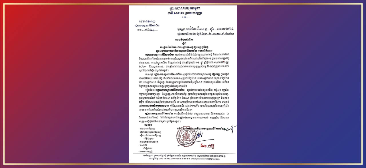 រដ្ឋបាលខណ្ឌពោធិ៍សែនជ័យបិទជាបណ្តោះអាសន្ន ផ្សារអង្គ ស្ថិតក្នុងភូមិអង្គ សង្កាត់ចោមចៅទី៣ រយៈពេល ១៤ថ្ងៃ គិតពីថ្ងៃទី២៤ មេសា-៧ ឧសភា