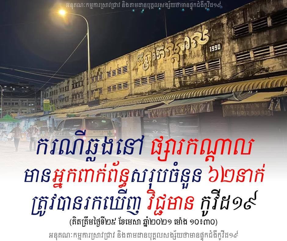 ករណីឆ្លងកូវីដ១៩នៅផ្សារកណ្ដាលអ្នកពាក់ព័ន្ធសរុបចំនួន ៦២នាក់ បានរកឃើញ វិជ្ជមានកូវីដ១៩One-Minuteអត្ថបទដោយ៖AMS OneMinute គិតត្រឹមថ្ងៃទី ២៥ ខែមេសា ឆ្នាំ២០២១ វេលាម៉ោង ១០៖៣០ ព្រឹក AMS OneMinuteអត្ថបទមុនអត្ថបទបន្ទាប់