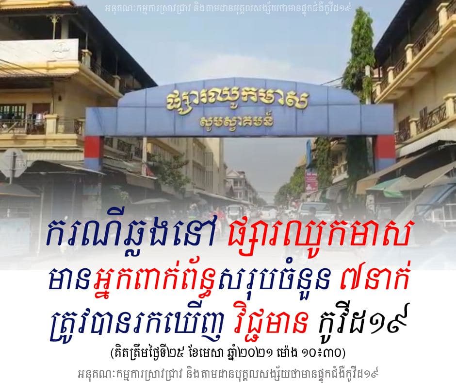 ករណីឆ្លងកូវីដ១៩នៅផ្សារឈូកមាស អ្នកពាក់ព័ន្ធសរុបចំនួន ៧នាក់ បានរកឃើញ វិជ្ជមានកូវីដ១៩One-Minuteអត្ថបទដោយ៖AMS OneMinute គិតត្រឹមថ្ងៃទី២៥ មេសា ២០២១ វេលាម៉ោង ១០៖៣០ព្រឹក AMS OneMinuteអត្ថបទមុនអត្ថបទបន្ទាប់