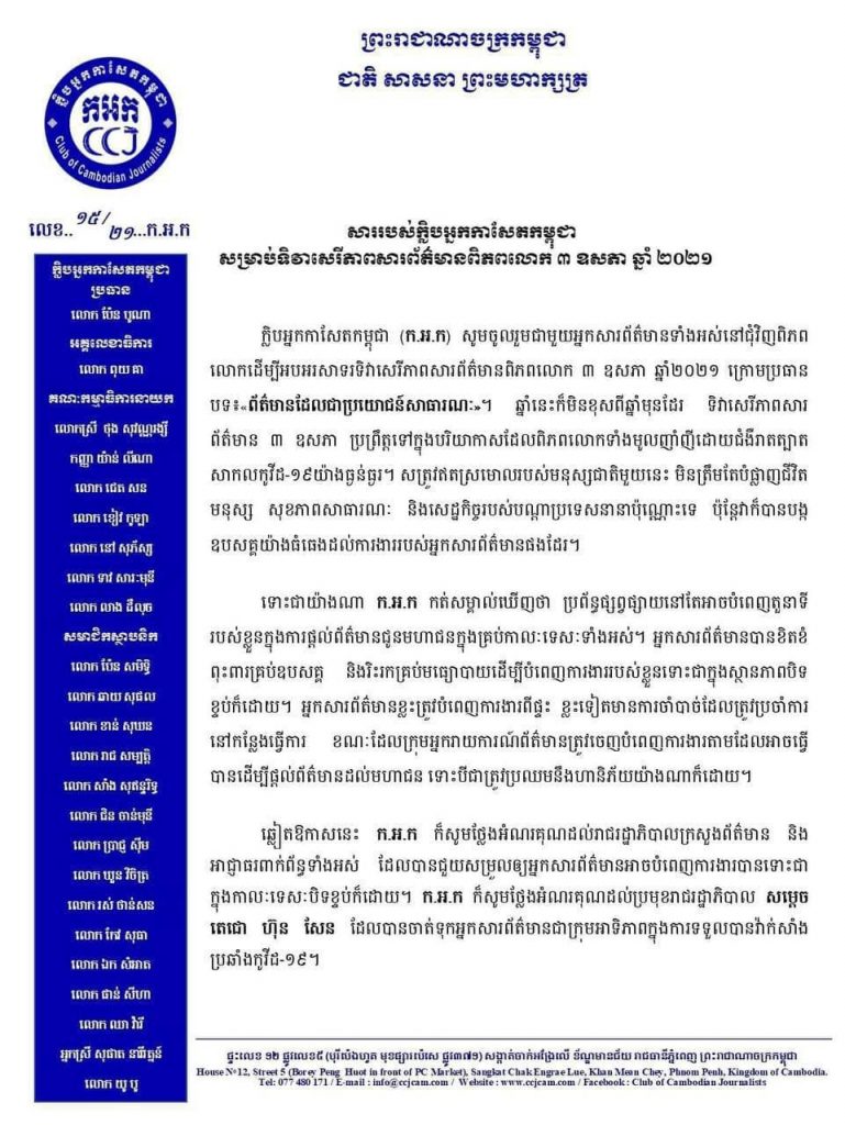 ដកស្រង់ពីសាររបស់ក្លិបអ្នកកាសែតកម្ពុជា ក្នុងឱកាសនៃទិវាសេរីភាពសារព័ត៌មានពិភពលោក ៣ ឧសភា ២០២១។