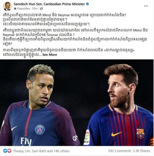តើកំពូលកីឡាករបាល់ទាត់ Messi និង Neymar អាចស្លាប់ទេ ក្រោយចាក់វ៉ាក់សាំងចិន? ប្រសិនជាគាត់ចាក់មែននាប៉ុន្មានថ្ងៃខាងមុខ។ នេះបើយោងតាមការបង្ហោះនៅលើផេកផ្លូវការ របស់សម្តេចតេជោ ហ៊ុនសែន នាល្ងាចថ្ងៃទី២ ខែឧសភា មុននេះបន្តិច ដែលដកស្រងពីសារព័ត៌មានស៊ិនហួររបស់ចិន។