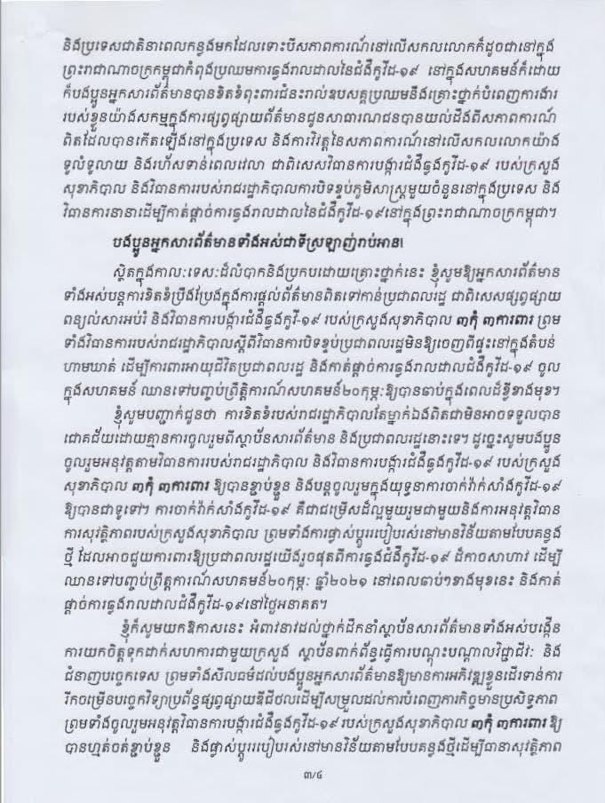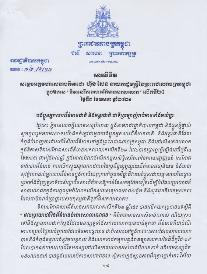 សារលិខិត សម្តេចអគ្គមហាសេនាបតីតេជោ ហ៊ុន សែន នាយករដ្ឋមន្រ្តីនៃព្រះរាជាណាចក្រកម្ពុជា ក្នុងឱកាស «ទិវាសេរីភាពសារព័ត៌មានសកលលោក» លើកទី២៨ ថ្ងៃទី០៣ ខែឧសភា ឆ្នាំ២០២១៖
