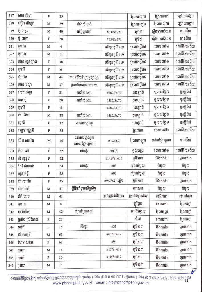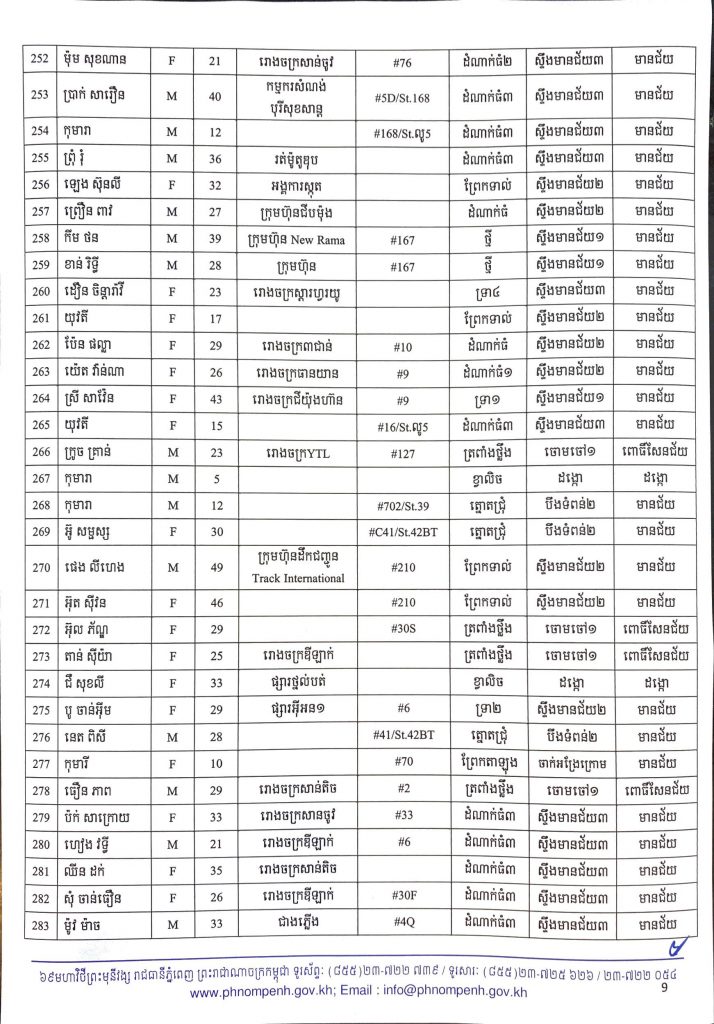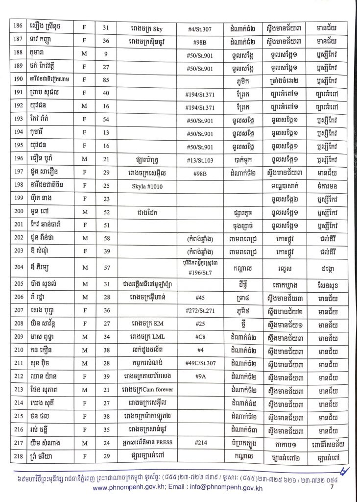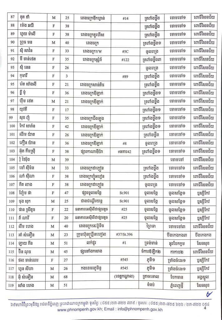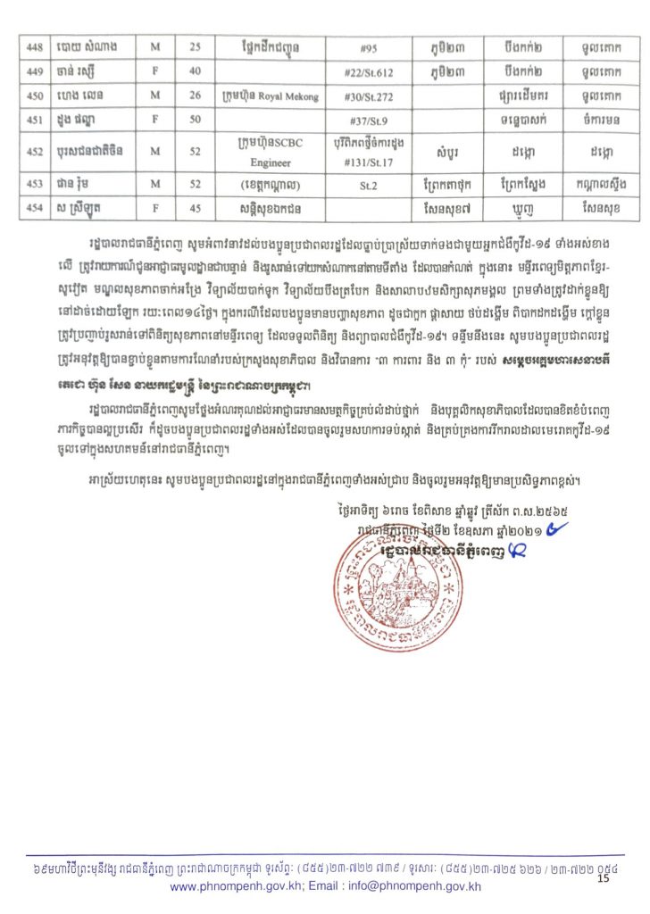 នៅថ្ងៃទី០១ ខែឧសភា ឆ្នាំ២០២១ នៅរាជធានីភ្នំពេញ រកឃើញករណីវិជ្ជមានកូវីដ-១៩ ចំនួន ៤៥៤នាក់ទៀត ដែលជាករណីឆ្លងក្នុងសហគមន៍ រដ្ឋបាលរាជធានីភ្នំពេញ សូមអំពាវនាវដល់បងប្អូនប្រជាពលរដ្ឋដែលធ្លាប់ប្រាស្រ័យទាក់ទងជាមួយអ្នកជំងឺកូវីដ-១៩ ទាំងអស់ខាងក្រោម ត្រូវរាយការណ៍ជូនអាជ្ញាធរមូលដ្ឋានជាបន្ទាន់ និងរួសរាន់ទៅយកសំណាកនៅតាមទីតាំងដែលបានកំណត់។