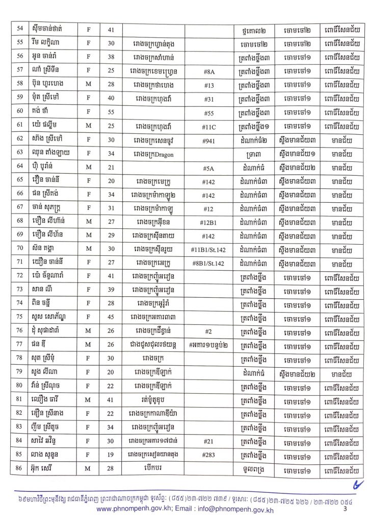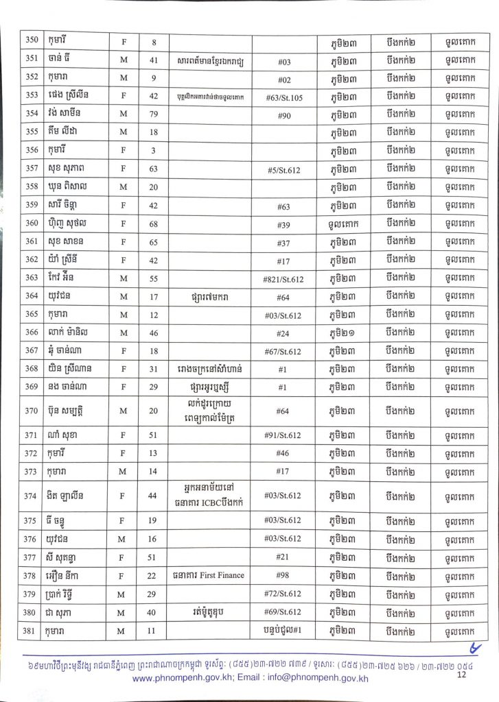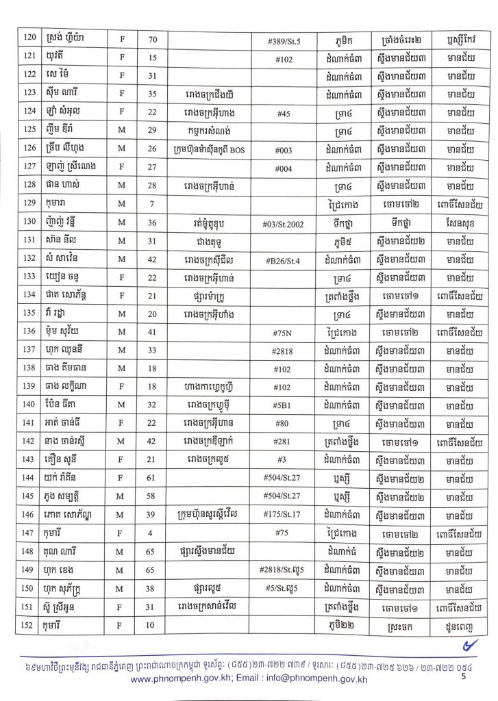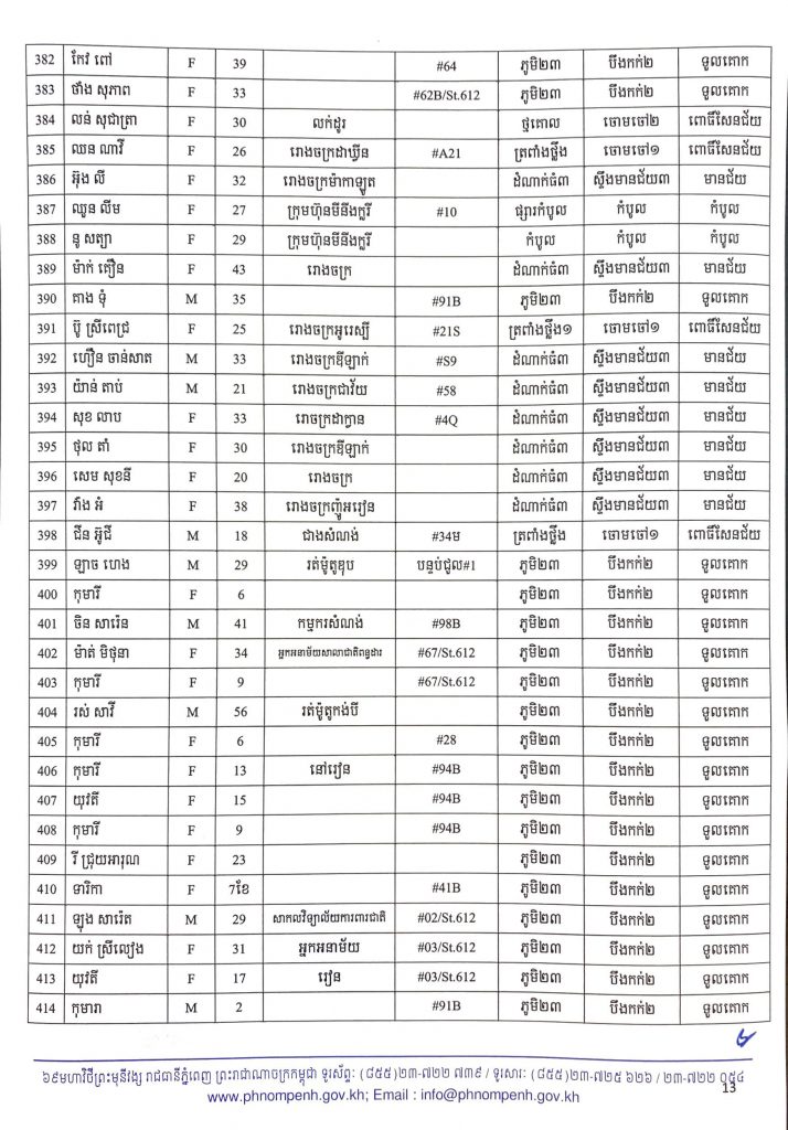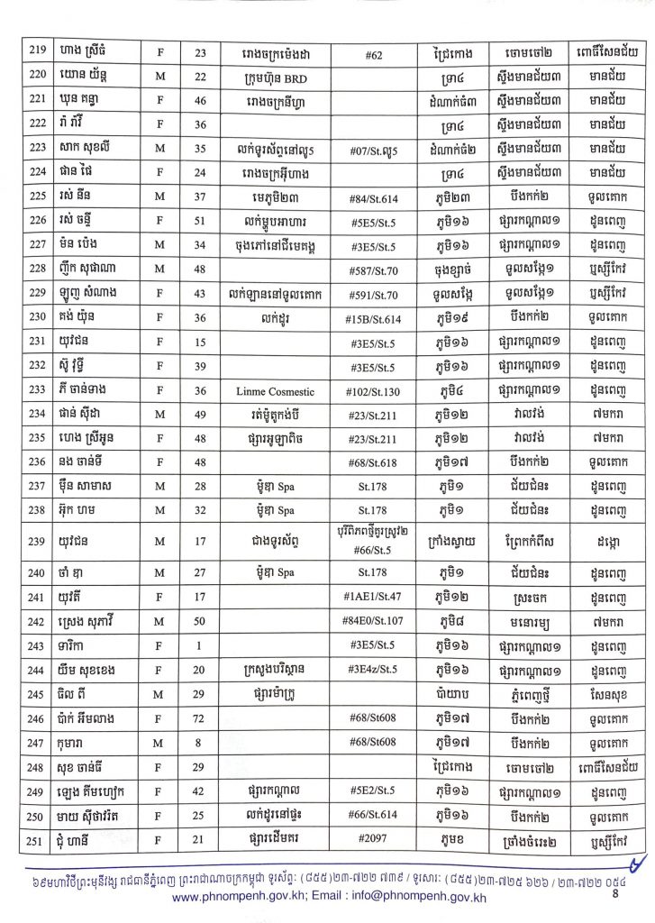 នៅថ្ងៃទី០១ ខែឧសភា ឆ្នាំ២០២១ នៅរាជធានីភ្នំពេញ រកឃើញករណីវិជ្ជមានកូវីដ-១៩ ចំនួន ៤៥៤នាក់ទៀត ដែលជាករណីឆ្លងក្នុងសហគមន៍ រដ្ឋបាលរាជធានីភ្នំពេញ សូមអំពាវនាវដល់បងប្អូនប្រជាពលរដ្ឋដែលធ្លាប់ប្រាស្រ័យទាក់ទងជាមួយអ្នកជំងឺកូវីដ-១៩ ទាំងអស់ខាងក្រោម ត្រូវរាយការណ៍ជូនអាជ្ញាធរមូលដ្ឋានជាបន្ទាន់ និងរួសរាន់ទៅយកសំណាកនៅតាមទីតាំងដែលបានកំណត់។