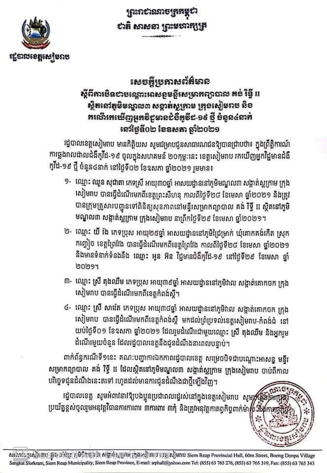 រដ្ឋបាលខេត្តសៀមរាប មានកិត្តិយស សូមជម្រាបជូនសាធារណជនឱ្យបានជ្រាបថា៖ ក្នុងព្រឹត្តិការណ៍ការឆ្លងរាលដាលជំងឺកូវីដ-១៩ ចូលក្នុងសហគមន៍ ២០កុម្ភៈនេះ ខេត្តសៀមរាប រកឃើញអ្នកវិជ្ជមានជំងឺកូវីដ-១៩ ថ្មី ចំនួន៤នាក់ នៅថ្ងៃទី០២ ខែឧសភា ឆ្នាំ២០២១ រួមមាន៖