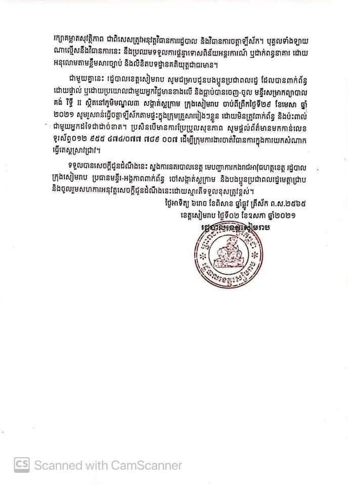 ជាមួយគ្នានេះ រដ្ឋបាលខេត្តសៀមរាប សូមជម្រាបជូនបងប្អូនប្រជាពលរដ្ឋ ដែលបានពាក់ព័ន្ធដោយផ្ទាល់ ឬដោយប្រយោលជាមួយអ្នកវិជ្ជមានខាងលើ និងធ្លាប់បានចេញ-ចូល មន្ទីរសម្រាកព្យាបាល គង់ រិទ្ធី II ស្ថិតនៅភូមិមណ្ឌល៣ សង្កាត់ស្លក្រាម ក្រុងសៀមរាប ចាប់ពីព្រឹកថ្ងៃទី២៩ ខែមេសា ឆ្នាំ២០២១ សូមរួសរាន់ធ្វើចត្តាឡីស័កតាមផ្ទះក្នុងក្រុមគ្រួសាររៀងៗខ្លួន ដោយមិនត្រូវពាក់ព័ន្ធ និងប៉ះពាល់ជាមួយអ្នកដទៃជាដាច់ខាត។ ប្រសិនបើមានការប្រែប្រួលសុខភាព សូមផ្តល់ព័ត៌មានមកកាន់លេខទូរស័ព្ទ០១២ ៩៥៥ ៤៧៤/០៧៧ ៧៨៩ ០០៧ ដើម្បីក្រុមការងារចាត់វិធានការក្នុងការយកសំណាកធ្វើតេស្តស្រាវជ្រាវ។