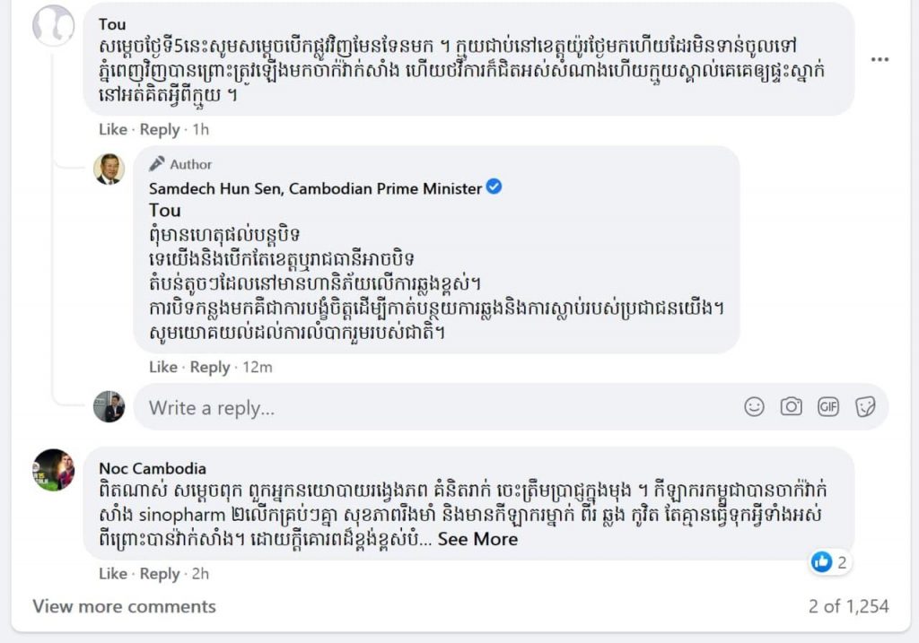សម្ដេចតេជោ ហ៊ុន សែនបញ្ជាក់បែបនេះ ជាការគឺឆ្លើយតបទៅនឹងអ្នកខមមិន( Comment) ដែលបានចូលទៅ Comment ក្នុងហ្វេសបុករបស់សម្ដេចថា ចង់ដឹងអំពីស្ថានភាពក្រោយថ្ងៃទី០៦ ខែឧសភា ឆ្នាំ២០២១ ដែលជាថ្ងៃកំណត់បើករាជធានីភ្នំពេញឡើងវិញ ក្រោយបិទខ្ទប់រយៈពេល៣សប្ដាហ៍ ដើម្បីទប់ស្កាត់ការឆ្លងរីករាលដាល ជំងឺកូវីដ១៩។