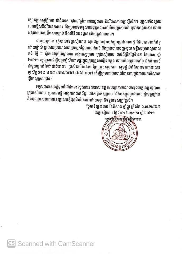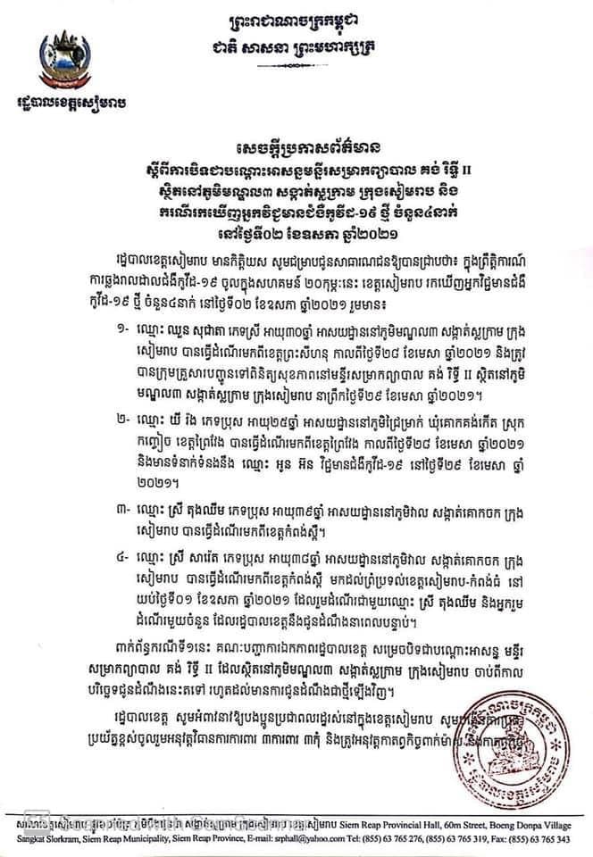 រកឃើញអ្នកវិជ្ជមានកូវីដ១៩ចំនួន ៤នាក់ ធ្លាប់ចូុលពិនិត្យសុខភាពនៅទីតាំងខាងលើ ស្ថិតនៅភូមិមណ្ឌល៣ សង្កាត់ស្លក្រាម ក្រុងសៀមរាប ចាប់ពីថ្ងៃទី២៩ មេសា ២០២១