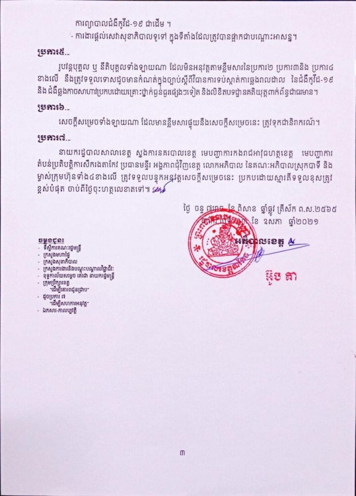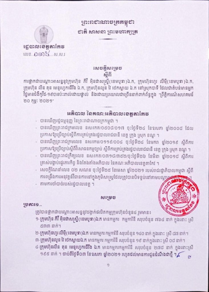 រោងចក្រចំនួន ៤ នៅខេត្តតាកែវត្រូវអាជ្ញាធរផ្អាកជាបណ្ដោះអាសន្ន