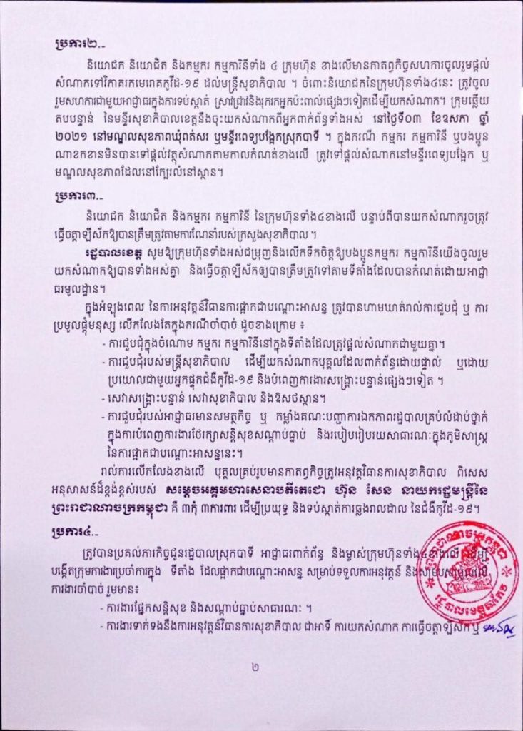 រោងចក្រចំនួន ៤ នៅខេត្តតាកែវត្រូវអាជ្ញាធរផ្អាកជាបណ្ដោះអាសន្ន។ ជាមួយគ្នានោះ កម្មករសរុបជាង ១ពាន់២០០នាក់ ត្រូវតែទៅយកសំណាក!។