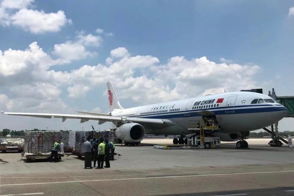 វ៉ាក់សាំងបង្ការជំងឺកូវីដ១៩ ចំនួន៥០ម៉ឺនដូស ដែលជាជំនួយរបស់ប្រទេសចិនត្រូវបានបញ្ជូនទៅដល់ចំណតអាកាសយានដ្ឋានអន្តរជាតិយ៉ាងហ្គូន ប្រទេសមីយ៉ាន់ម៉ាហើយ កាលពីថ្ងៃអាទិត្យ ទី២ ឧសភា ២០២១។