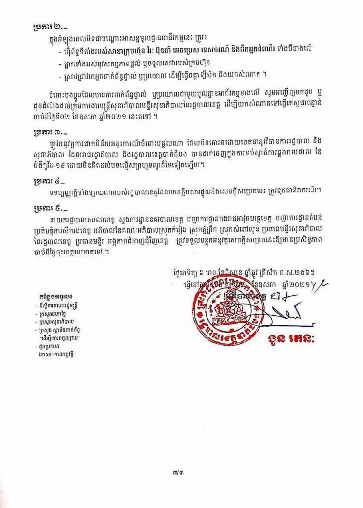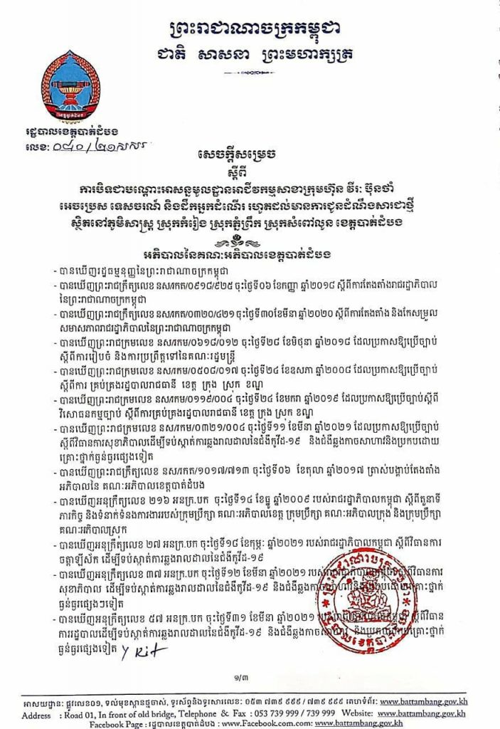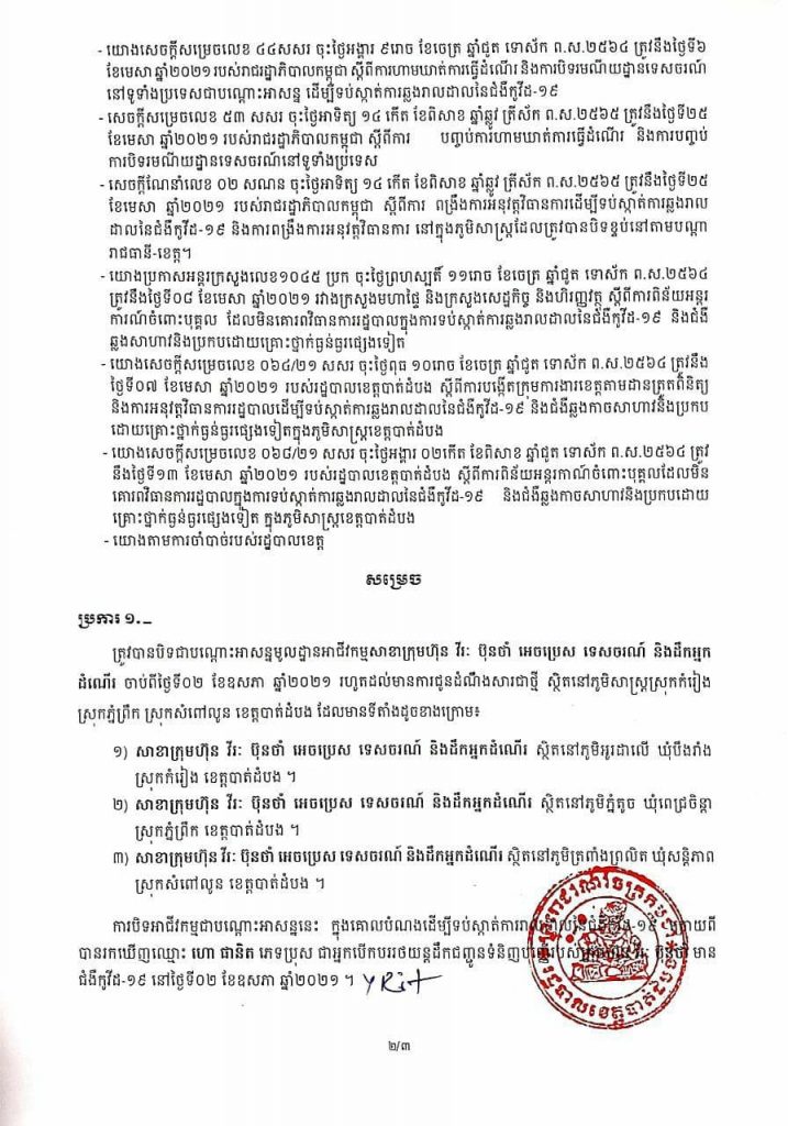 ក្នុងសេចក្តីសម្រេចនេះបានបញ្ជាក់យ៉ាងច្បាស់ក្រោយពីអាជ្ញាធរមានសមត្ថកិច្ចបានរកឃើញថា៖ឈ្មោះ ហោ ផានិត ភេទប្រុស ជាអ្នកបើកបររថយន្តដឹកជញ្ជូនទំនិញបញ្ញើរសាខាក្រុមហ៊ុន វីរៈប៊ុនថាំមានជម្ងឺកូវីដ-19 នៅថ្ងៃទី២ ខែឧសភាឆ្នាំ២០២១នេះ ទើបរដ្ឋបាលខេត្តបាត់ដំបង បានចេញសេចក្តីសម្រេច ត្រូវបិទជាបណ្តោះអាសន្ននូវមូលដ្ឋានអាជីវកម្ម សាខាក្រុមហ៊ុន វីរៈ ប៊ុនថាំ អេចប្រេស និងដឹកអ្នកដំណើរ ចាប់ពីថ្ងៃទី០២ខែឧសភា ២០២១រហូតដល់មានការជូនដំណឹងសារជាថ្មី ដែលស្ថិតក្នុងភូមិសាស្ត្រ ស្រុកកំរៀង ភ្នំព្រឹក និងស្រុកសំពៅលូន ខេត្តបាត់ដំបង ដែលមានទីតាំង ដូចខាងក្រោមនេះ៖១-សាខាក្រុមហ៊ុនវីវៈប៊ុនថាំ ស្ថិតនៅភូមិអូរដាលើ ឃុំបឹងរាំង ស្រុកកំរៀង។២-សាខាក្រុមហ៊ុនវីរៈប៊ុនថាំ ស្ថិតនៅ ភូមិភ្នំតូច ឃុំពេជ្រចិន្តា ស្រុកភ្នំព្រឹក។៣- សាខាក្រុមហ៊ុន វីរៈប៊ុនថាំ ស្ថិតនៅភូមិត្រពាំងព្រលិត ឃុំសន្តិភាព ស្រុកសំពៅលូន។