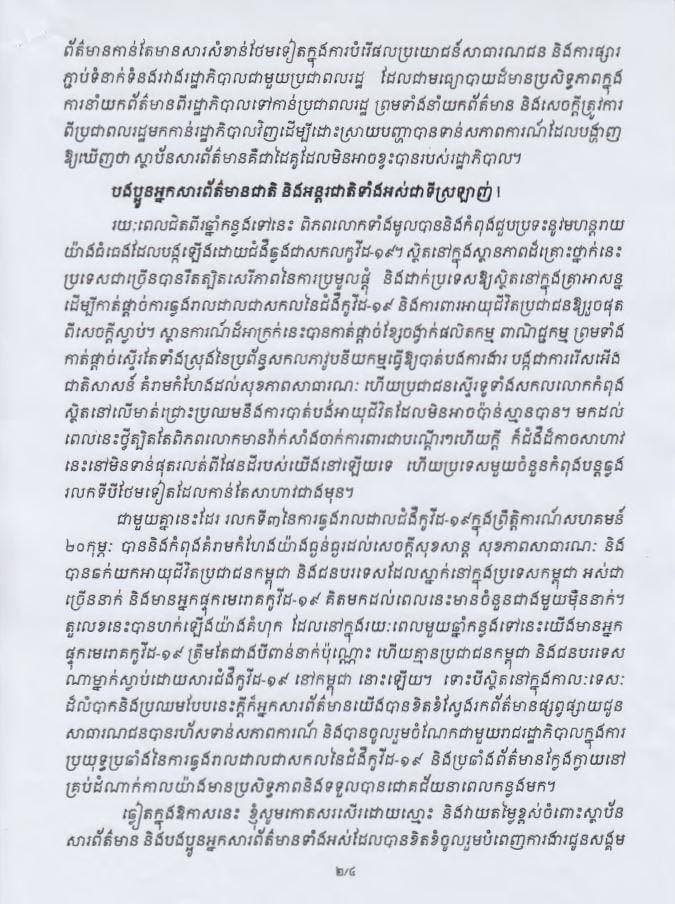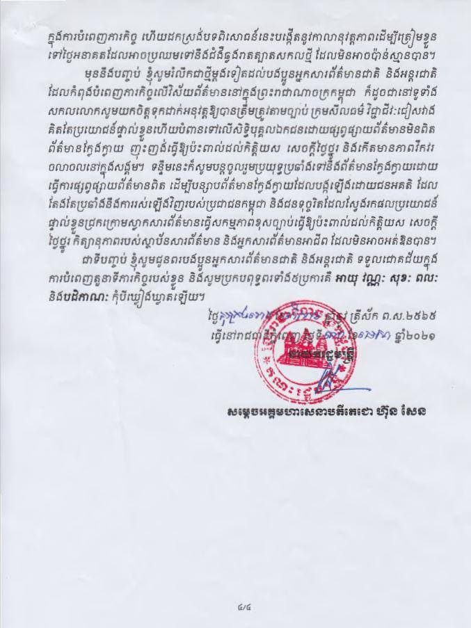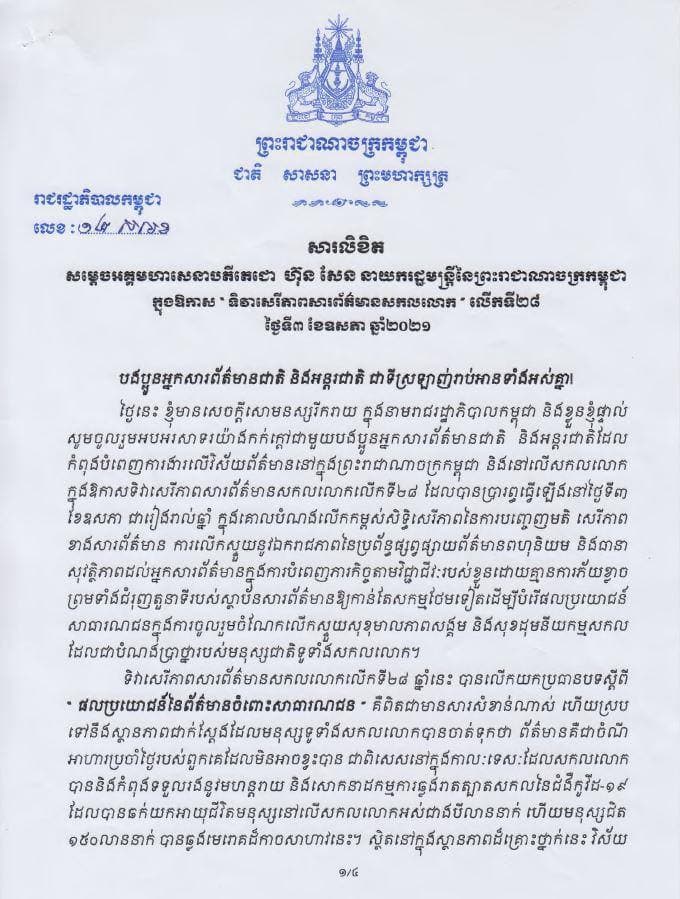 សារលិខិតសម្តេចតេជោនាយករដ្ឋមន្ត្រី ក្នុងឱកាស “ទិវាសេរីភាពសារព័ត៌មានសកលលោក” លើកទី២៨One-Minuteអត្ថបទដោយ៖AMS OneMinute ៣ ឧសភា ២០២១ AMS OneMinuteអត្ថបទមុនអត្ថបទបន្ទាប់