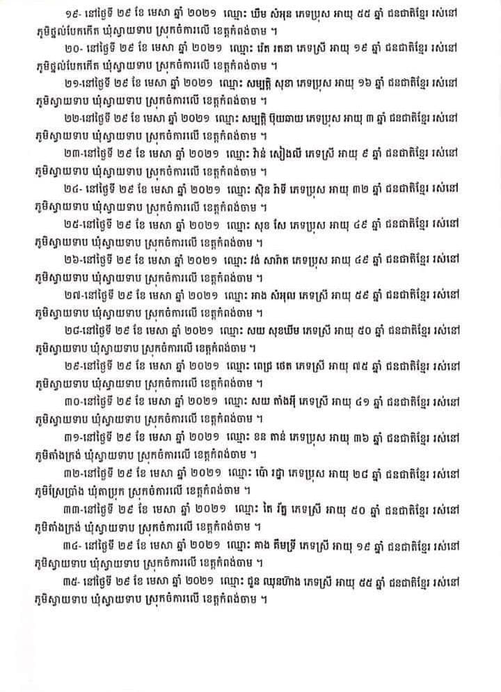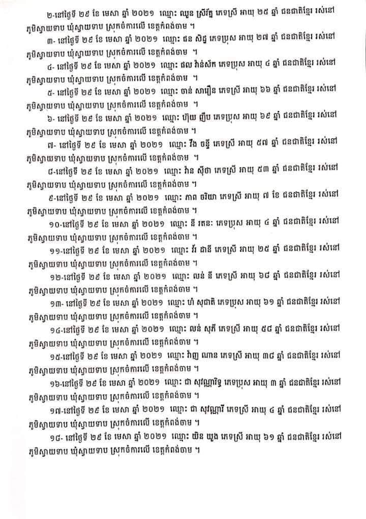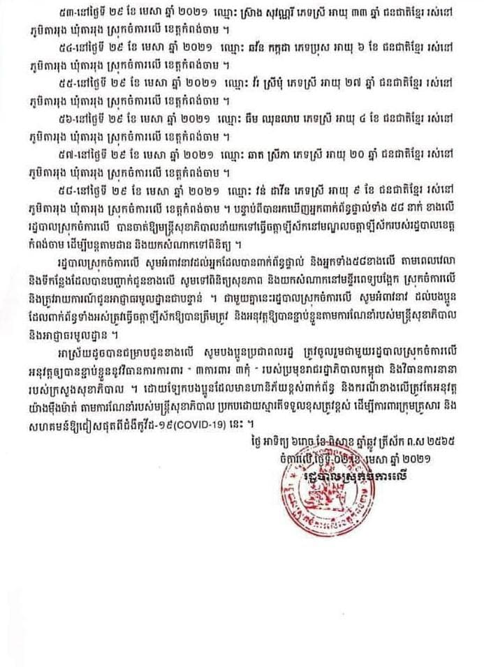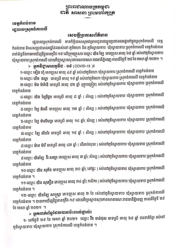 កំពង់ចាមរកឃើញអ្នកកើតជំងឺកូវីដ១៩ ចំនួន១២នាក់បន្ថែមទៀត នៅស្រុកចំការលើOne-Minuteអត្ថបទដោយ៖AMS OneMinute មនុស្ស៥៨នាក់ផ្សេងទៀតរកឃើញពាក់ព័ន្ធផ្ទាល់ និងប្រយោល ២ ឧសភា ២០២១ AMS OneMinuteអត្ថបទមុនអត្ថបទបន្ទាប់