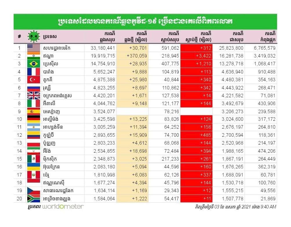 ប្រទេសដែលមានករណីឆ្លងកូវីដ១៩ ច្រើនជាងគេលើពិភពលោកOne-Minuteអត្ថបទដោយ៖AMS OneMinute គិតត្រឹមថ្ងៃទី៣ ឧសភា ២០២១ ប្រភព៖ កូវីដ-១៩ នៅកម្ពុជា 🇰🇭 AMS OneMinuteអត្ថបទមុនអត្ថបទបន្ទាប់