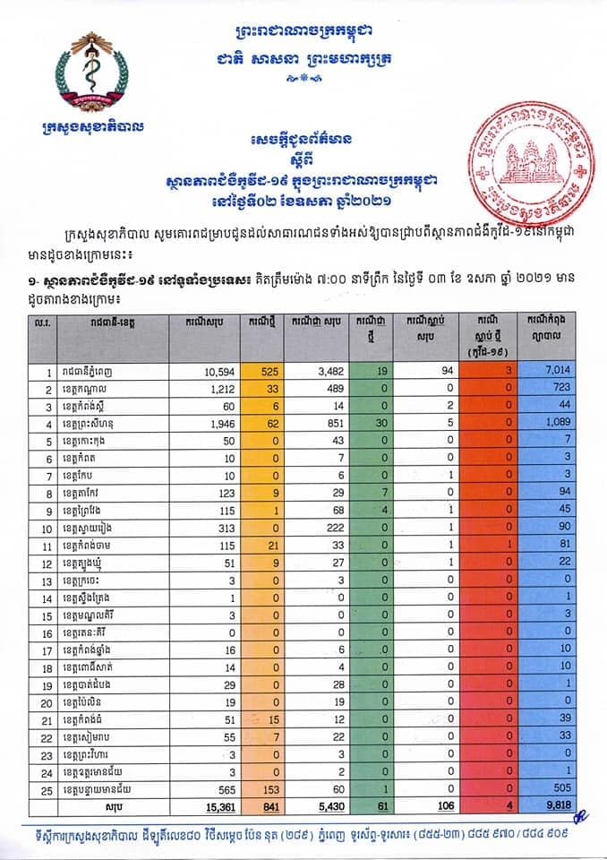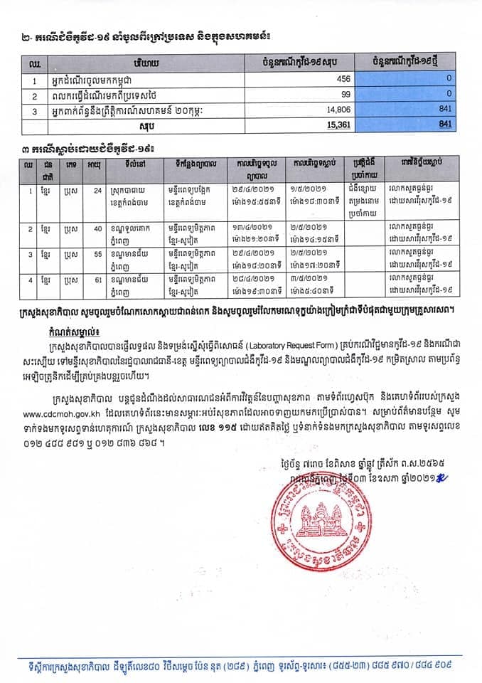 យោងតាមក្រសួងសុខាភិបាលនៅថ្ងៃទី៣ ឧសភា ឆ្នាំ២០២១ បានឲ្យដឹងថា កាលពីថ្ងៃទី ២ ឧសភា គេបានរកឃើញអ្នកវិជ្ជមានកូវីដ-១៩ ចំនួន ៨៤១នាក់ ដែលអ្នកទាំងនោះពាក់ព័ន្ធនឹងព្រឹត្តិការណ៍សហគមន៍ ២០កុម្ភៈ ទាំងអស់។ ជាមួយគ្នានេះ ក្រសួងសុខាភិបាលប្រកាសថា នៅថ្ងៃនេះ មានអ្នកជាសះស្បើយពីជំងឺកូវីដ-១៩ ចំនួន៦១នាក់ផងដែរ។ យោងតាមរបាយការណ៍របស់ក្រសួងសុខាភិបាល គិតមកដល់ថ្ងៃទី៣ឧសភាឆ្នាំ២០២១ កម្ពុជាមានអ្នកឆ្លងជំងឺកូវីដ-១៩ ចំនួន ១ម៉ឺន ៥ពាន់៣៦១នាក់ ក្នុងនោះបានព្យាបាលជាសះស្បើយចំនួន៥ពាន់៤៣០នាក់ និងនៅសល់ ចំនួន៩ពាន់៨១៨នាក់ កំពុងសម្រាកព្យាបាល។ ជាមួយគ្នានោះ ក្រសួងសុខាភិបាលបានបញ្ជាក់ថា រហូតមកដល់ពេលនេះ កម្ពុជាមានអ្នកស្លាប់ដោយសារជំងឺកូវីដ-១៩ចំនួន១០៦នាក់ហើយ។