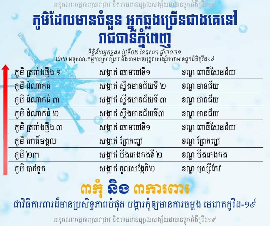 ក្រសួងសុខាភិបាលនៅថ្ងៃទី៣ឧសភានេះ បានប្រកាសថា កម្ពុជាមានអ្នកឆ្លងជំងឺកូវីដ-១៩ចំនួន៨៤១នាក់ ក្នុងនោះរាជធានីភ្នំពេញ មានអ្នកឆ្លងច្រើនជាងគេ គឺចំនួន៥២៥នាក់។ អនុគណៈកម្មការស្រាវជ្រាវជំងឺកូវីដ-១៩នៅថ្ងៃទី៣ឧសភាឆ្នាំ២០២១ បានបង្ហាញឈ្មោះភូមិចំនួន៨ ដែលត្រូវគេរាយការណ៍ថា មានការឆ្លងជំងឺកូវីដ-១៩ខ្លាំងជាងគេក្នុងរាជធានីភ្នំពេញ។