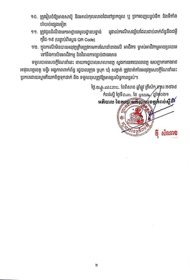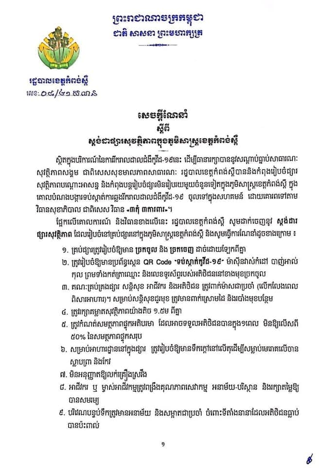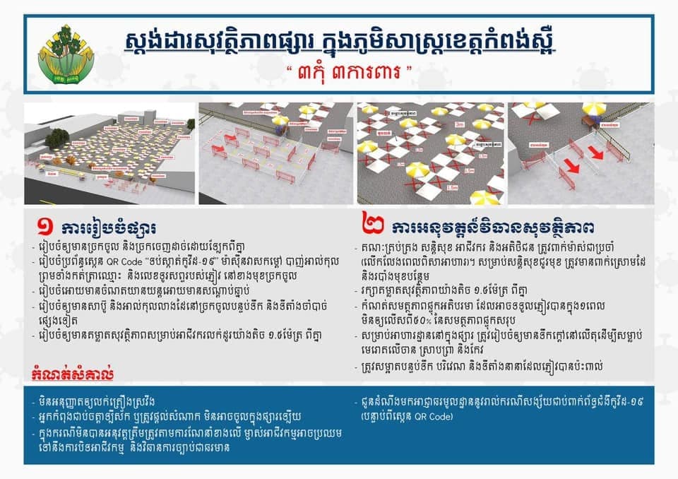 ខេត្តកំពង់ស្ពឺ ចេញសេចក្តីណែនាំ ស្តីពីការអនុវត្តស្តង់ដារផ្សារសុវត្ថិភាព ក្នុងភូមិសាស្ត្រខេត្ត៖