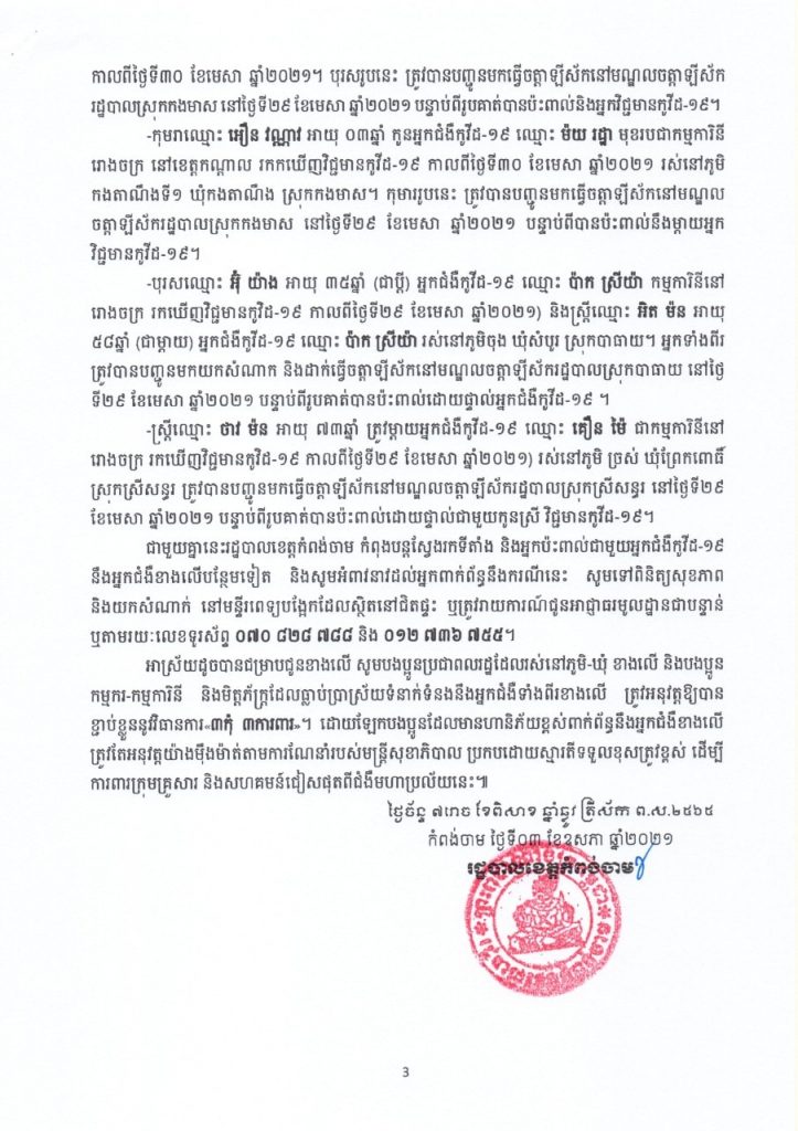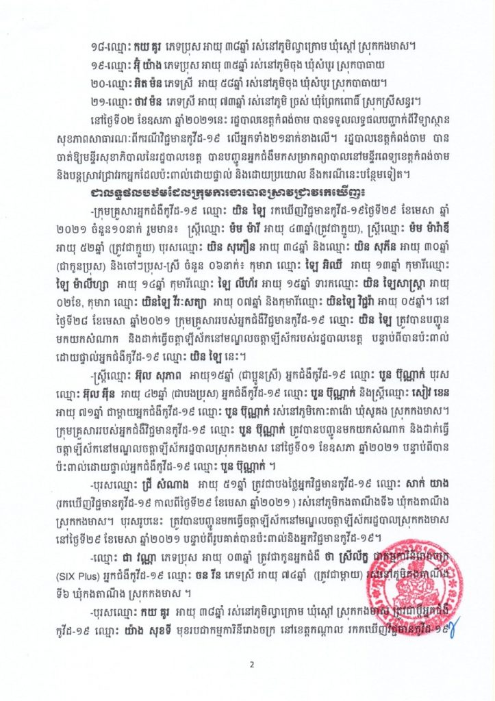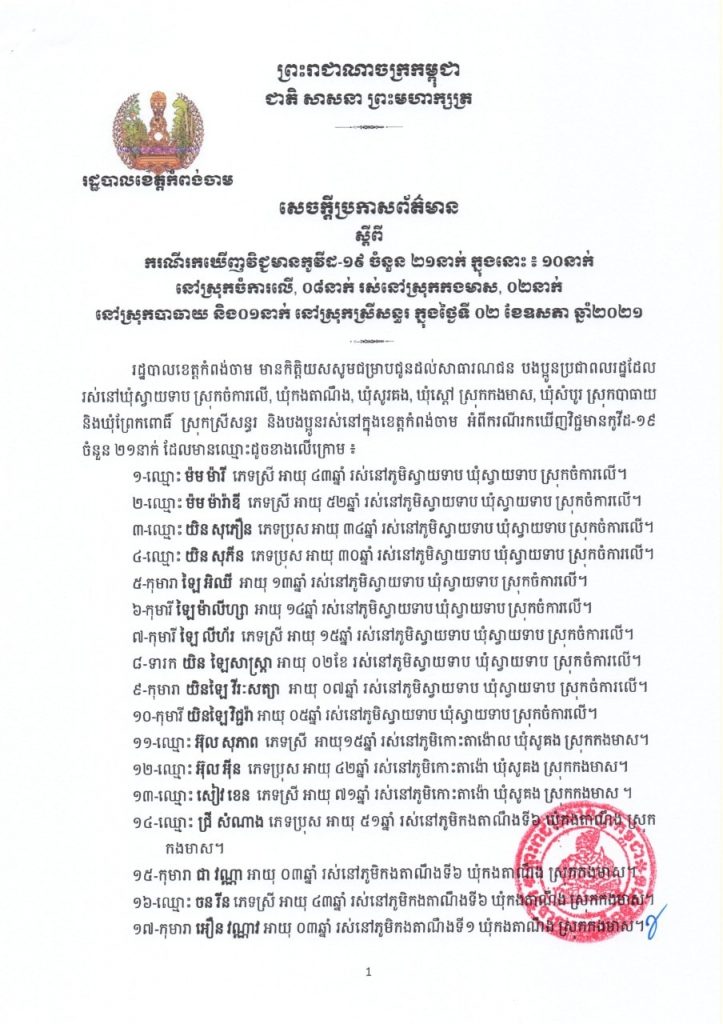 ខេត្តកំពង់ចាម រកឃើញវិជ្ជមានកូវីដ-១៩ ចំនួន ២១នាក់