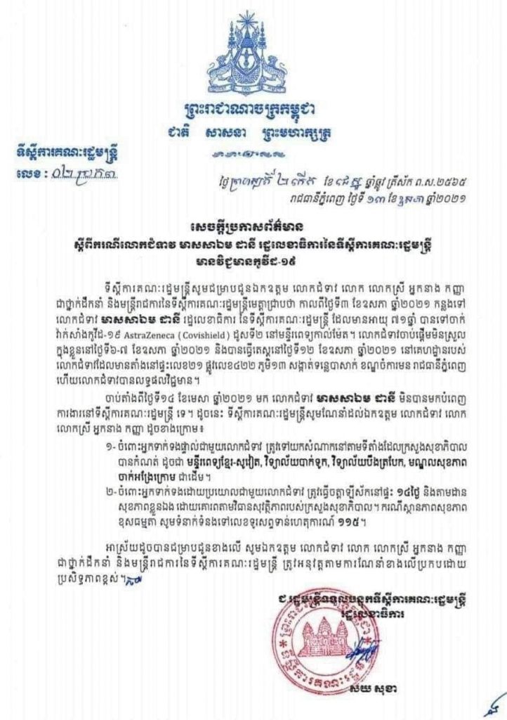យោងតាមសេចក្ដីប្រកាសព័ត៌មានរបស់ទីស្តីការគណៈរដ្ឋមន្ត្រី នៅថ្ងៃទី១៣ ឧសភានេះ បានឲ្យដឹងថា លោកជំទាវ មាស សាឯមដានី រដ្ឋលេខាធិការ នៃទីស្តីការគណៈរដ្ឋមន្ត្រី មានវិជ្ជមានកូវីដ-១៩។
