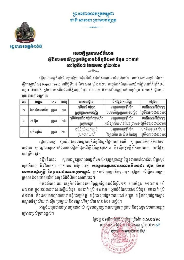 រដ្ឋបាលខេត្តកំពង់ធំ រកឃើញអ្នកវិជ្ជមានជំងឺកូវីដ១៩ ចំនួន ០៣នាក់ នៅថ្ងៃទី១៧ ឧសភាOne-Minuteអត្ថបទដោយ៖AMS OneMinute AMS OneMinuteអត្ថបទមុនអត្ថបទបន្ទាប់