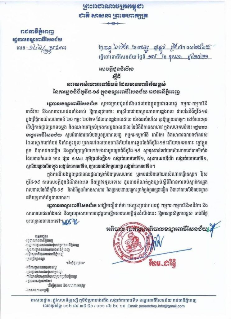 រដ្ឋបាលខណ្ឌពោធិ៍សែនជ័យ អំពាវនាវដល់ប្រជាពលរដ្ឋ កម្មករ-កម្មការិនី អាជីវករ និងសាធារជនទាំងអស់ ដែលស្នាក់នៅតំបន់មានហានិភ័យនៃការឆ្លងជំងឺកូវីដ១៩