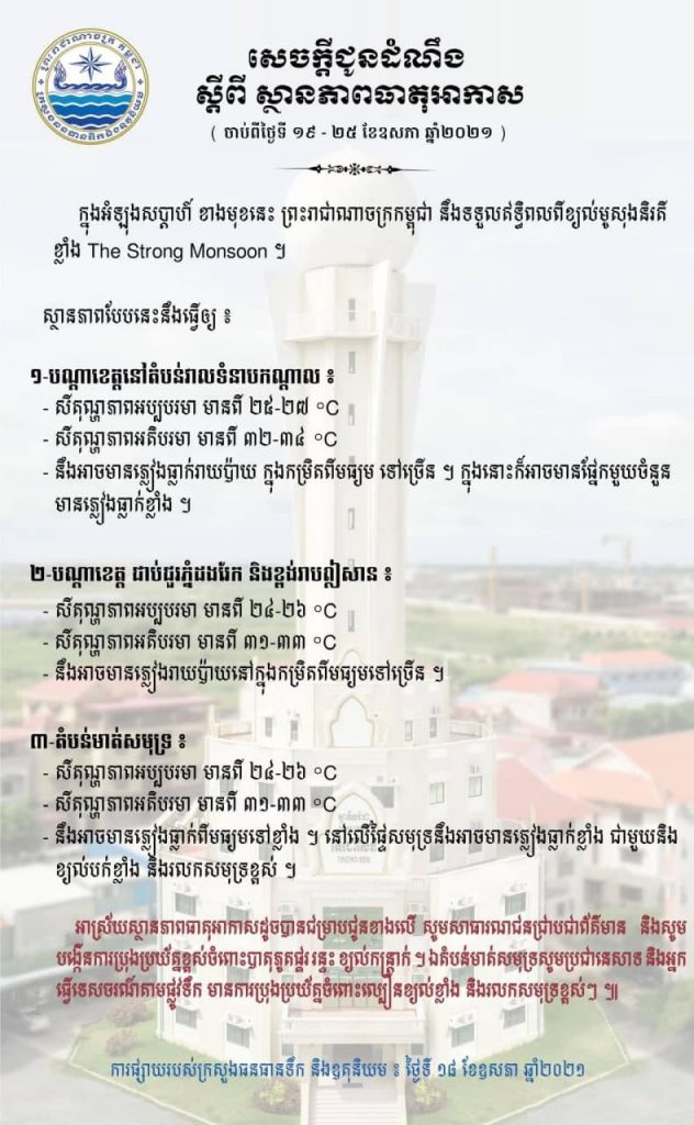 យោងតាមសេចក្ដីជូនដំណឹងរបស់ក្រសសួងធនធានទឹកនៅថ្ងៃទី១៨ ឧសភា ឆ្នាំ២០២១ បានឲ្យដឹងថា ក្នុងអំឡុងសប្ដាហ៏នេះ កម្ពុជានឹងទទួលរងឥទ្ធិពលពីខ្យល់មូសុងនិរតីខ្លាំង The Strong Monsoon។ ស្ថានភាពនោះនឹងធ្វើឲ្យបណ្ដាខេត្តនៅតំបន់ទំនាបកណ្ដាលអាចនឹងមានភ្លៀងធ្លាក់រាប៉ាយក្នុងកម្រិតពីមធ្យមទៅច្រើន ហើយមានផ្នែកមួយចំនួនក៏មានភ្លៀងធ្លាក់ខ្លាំងផងដែរ។