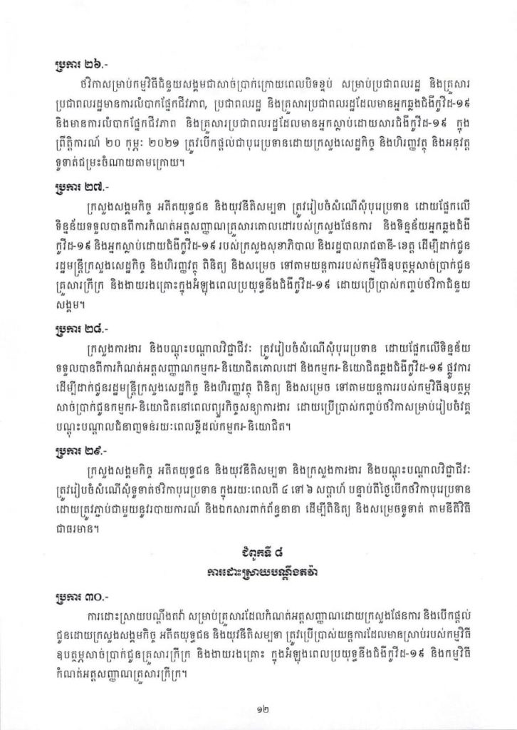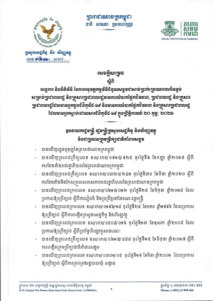 ភ្នំពេញៈក្រសួងសេដ្ឋកិច្ច និងហិរញ្ញវត្ថុ បានចេញសេចក្តីសម្រេចស្តីពីយន្តការ និងនីតិវិធី នៃការអនុវត្តកម្មវិធីជំនួយសង្គម ជាសាច់ប្រាក់ក្រោយពេលបិទខ្ទប់ សម្រាប់ប្រជាពលរដ្ឋ និងគ្រួសារប្រជាពលរដ្ឋមានការលំបាកផ្នែកជីវភាព, ប្រជាពលរដ្ឋ និងគ្រួសារ ប្រជាពលរដ្ឋដែលមានអ្នកឆ្លងជំងឺកូវីដ-១៩ និងមានការលំបាកផ្នែកជីវភាព និងគ្រួសារប្រជាពលរដ្ឋដែលមាន អ្នកស្លាប់ដោយសារជំងឺកូវីដ១៩ក្នុងព្រឹត្តិការណ៍២០កុម្ភៈ២០២១។ សេចក្តីសម្រេចនេះបានចុះហត្ថលេខាកាលពីថ្ងៃទី១៣ ខែឧសភា ឆ្នាំ២០២១ ដោយឯកឧត្តមឧបនាយកករដ្ឋមន្រ្តី អូន ព័ន្ធមុនីរ័ត្ន រដ្ឋមន្រ្តីក្រសួងសេដ្ឋកិច្ច និងហិរញ្ញវត្ថុ។