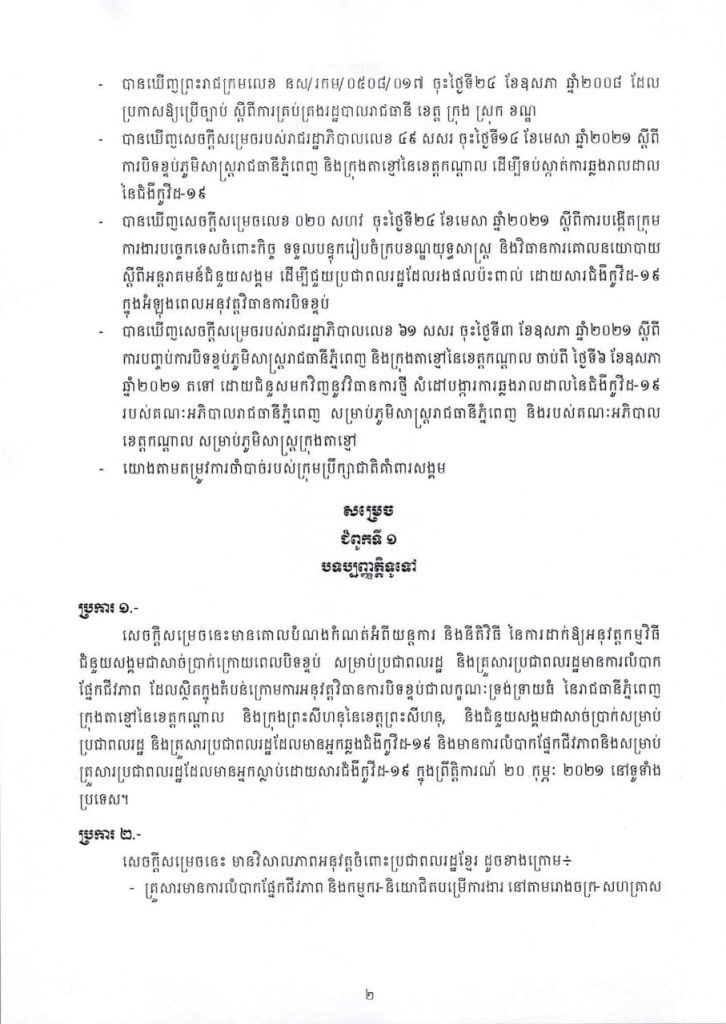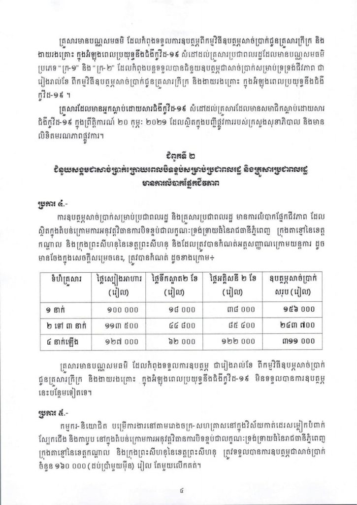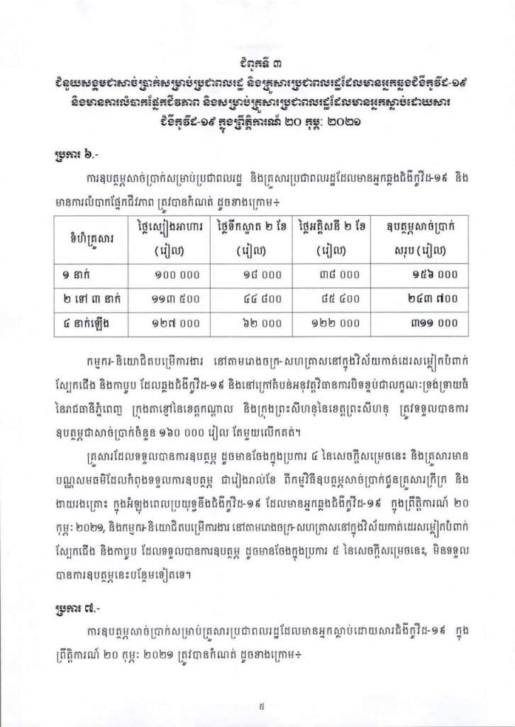 ២. គ្រួសារដែលមានអ្នកឆ្លងជំងឺកូវីដ-១៩ និងមានការលំបាកផ្នែកជីវភាព, កម្មករ និយោជិតបម្រើការងារ នៅតាមរោងចក្រ-សហគ្រាស នៅក្នុងវិស័យកាត់ដេរសម្លៀកបំពាក់ ស្បែកជើង និងកាបូបដែលឆ្លងជំងឺកូវីដ-១៩ និងនៅក្រៅតំបន់អនុវត្តវិធានការបិទខ្ទប់ជាលក្ខណៈទ្រង់ទ្រាយធំ នៃរាជធានីភ្នំពេញ ក្រុងតាខ្មៅនៃខេត្តកណ្តាល និងក្រុងព្រះសីហនុនៃខេត្តព្រះសីហនុ និងគ្រួសារ ប្រជាពលរដ្ឋដែលមានអ្នកស្លាប់ដោយសារជំងឺកូវី៥-១៩ ក្នុងព្រឹត្តិការណ៍ ២០ កុម្ភៈ ២០២១ ក្នុងភូមិសាស្រ្តទូទាំងប្រទេស។
