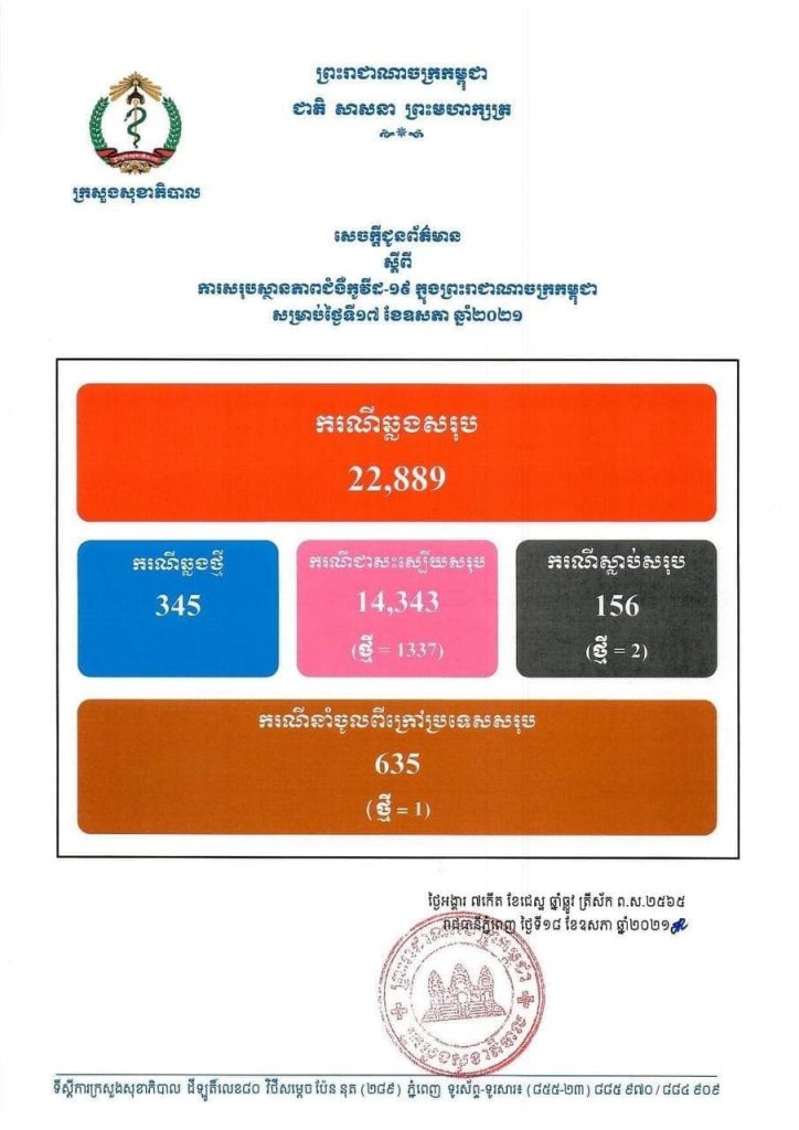 យោងតាមរបាយការណ៍របស់ក្រសួងសុខាភិបាល គិតមកដល់ថ្ងៃទី១៧ ឧសភា ឆ្នាំ២០២១ កម្ពុជាមានអ្នកឆ្លងជំងឺកូវីដ-១៩ ចំនួន ២ម៉ឺន ២ពាន់ ៨៨៩នាក់ ក្នុងនោះបានព្យាបាលជាសះស្បើយចំនួន ១ម៉ឺន ៤ពាន់៣៤៣នាក់ និងនៅសល់ ចំនួន ៨ពាន់ ៥៤៦នាក់ កំពុងសម្រាកព្យាបាល។ ជាមួយគ្នានោះ ក្រសួងសុខាភិបាលបាននៅថ្ងៃនេះ មានអ្នកស្លាប់ចំនួនថ្មីចំនួន៤នាក់ ដែលនាំឲ្យ កម្ពុជាមានអ្នកស្លាប់ដោយសារជំងឺកូវីដ-១៩ចំនួន១៥៦នាក់ហើយ។