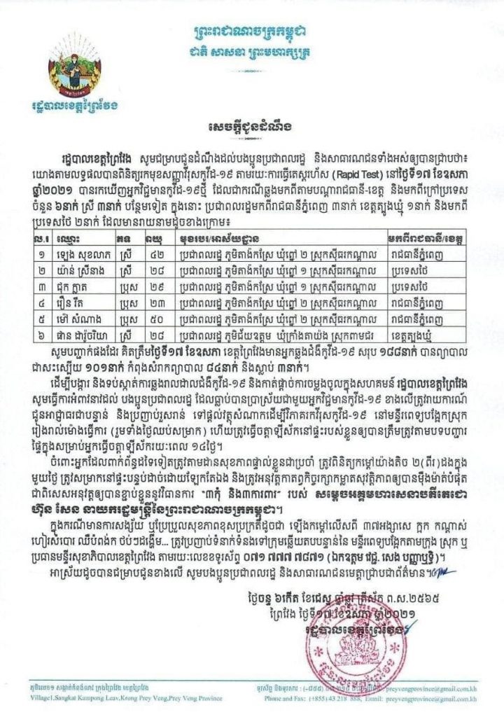 ខេត្តព្រៃវែង បង្ហាញអត្តសញ្ញាណអ្នកវិជ្ជមានកូវីដ១៩ ចំនួន ៦នាក់ទៀត រកឃើញថ្ងៃទី១៧ ឧសភា ដែលជាករណីឆ្លងមកពីបណ្តារាជធានី-ខេត្ត និងមកពីក្រៅប្រទេសOne-Minuteអត្ថបទដោយ៖AMS OneMinute AMS OneMinuteអត្ថបទមុនអត្ថបទបន្ទាប់