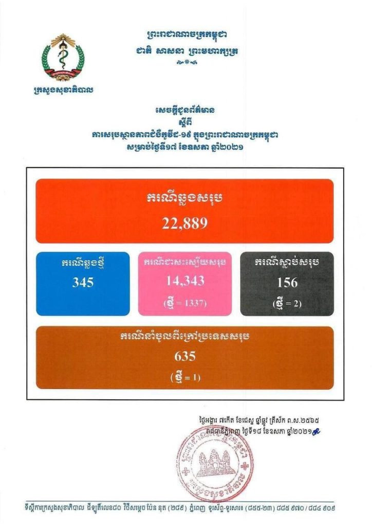 កូវីដ១៩នៅកម្ពុជា 🦠🇰🇭One-Minuteអត្ថបទដោយ៖AMS OneMinute រកឃើញករណីឆ្លងថ្មី ៣៤៥នាក់ជាសះស្បើយ ១៣៣៧នាក់ស្លាប់ ២នាក់ គិតត្រឹមថ្ងៃទី១៨ ឧសភា ២០២១ ចំនួនអ្នកឆ្លងសរុប៖ ២២៨៨៩នាក់ចំនួនអ្នកជាសះស្បើយ៖ ១៤៣៤៣នាក់ចំនួនអ្នកស្លាប់សរុប៖ ១៥៦នាក់ AMS OneMinuteអត្ថបទមុនអត្ថបទបន្ទាប់