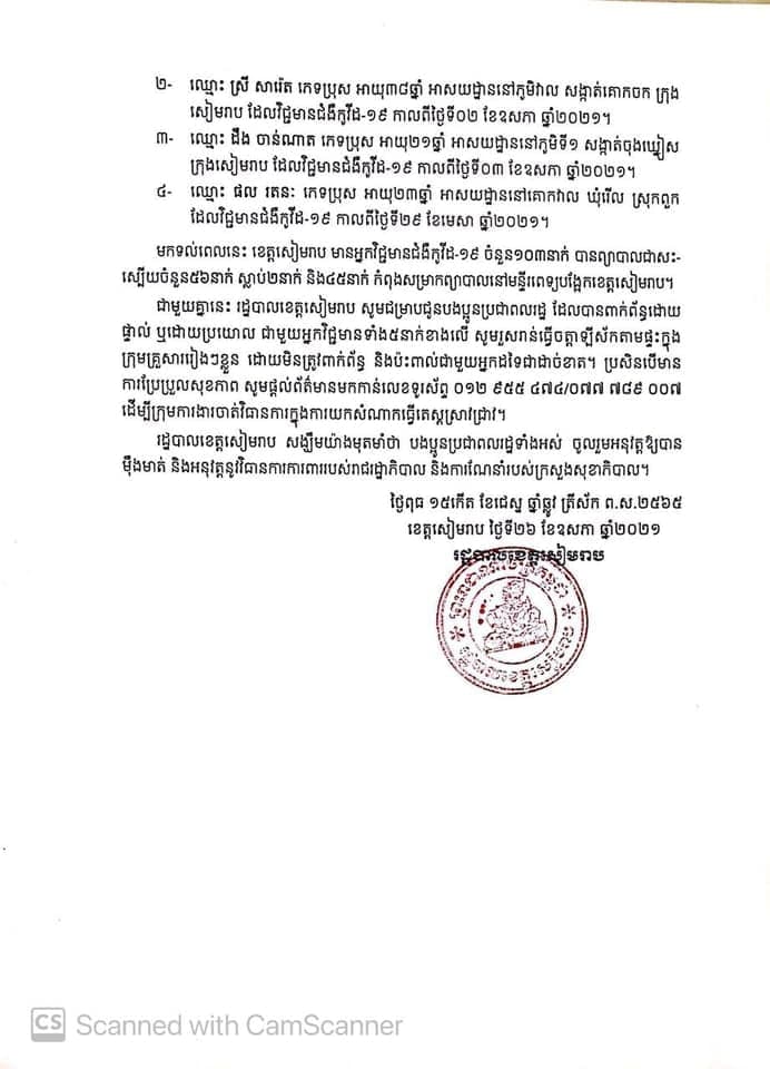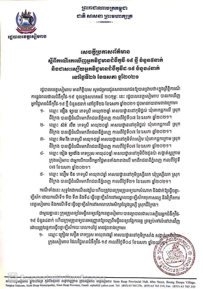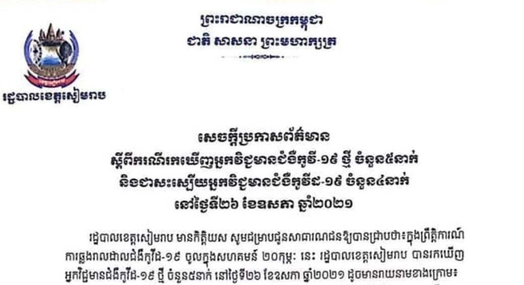 រដ្ឋបាលខេត្តសៀមរាប បានជូនដំណឹងថា នៅថ្ងៃទី២៦ឧសភាឆ្នាំ២០២១ រដ្ឋបាលខេត្តបានរកឃើញអ្នកវិជ្ជមានជំងឺកូវីដ-១៩ ថ្មី ចំនួន៥នាក់។ ក្នុងចំណោមអ្នកឆ្លងទាំង៥នាក់ មាន៤នាក់ជាអ្នកដំណើរពីរាជធានីភ្នំពេញ និងម្នាក់គឺជាអ្នកបើកបររថយន្តដឹកអ្នកដំណើរអ្នកវិជ្ជមានកូវីដ-១៩។ រដ្ឋបាលខេត្តបានបញ្ជាក់ថា ករណីទាំងនោះ សុទ្ធតែជាករណីសង្ស័យ ហើយត្រូវបានក្រុមគ្រូពេទ្យយកសំណាក និងដាក់ឱ្យធ្វើចត្តាឡីស័ក។