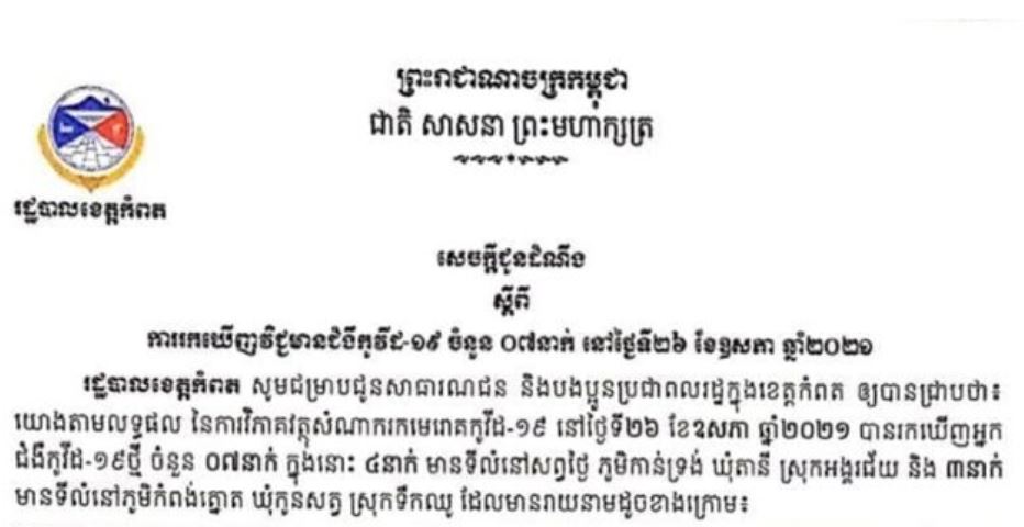 យោងតាមសេចក្ដីជូនដំណឹងរបស់រដ្ឋបាលខេត្តកំពត បានឲ្យដឹងថា ថ្ងៃទី២៦ឧ សភា គេបានរកឃើញករណីវិជ្ជមានវីរុសកូវីដ-១៩ លើចំនួន ៧នាក់។ ក្នុងចំណោមអ្នកវិជ្ជមានថ្មីនោះ មានអ្នករស់នៅស្រុកអង្គរជ័យចំនួន៤នាក់ និងស្រុកទឹកឈូចំនួន៣នាក់។