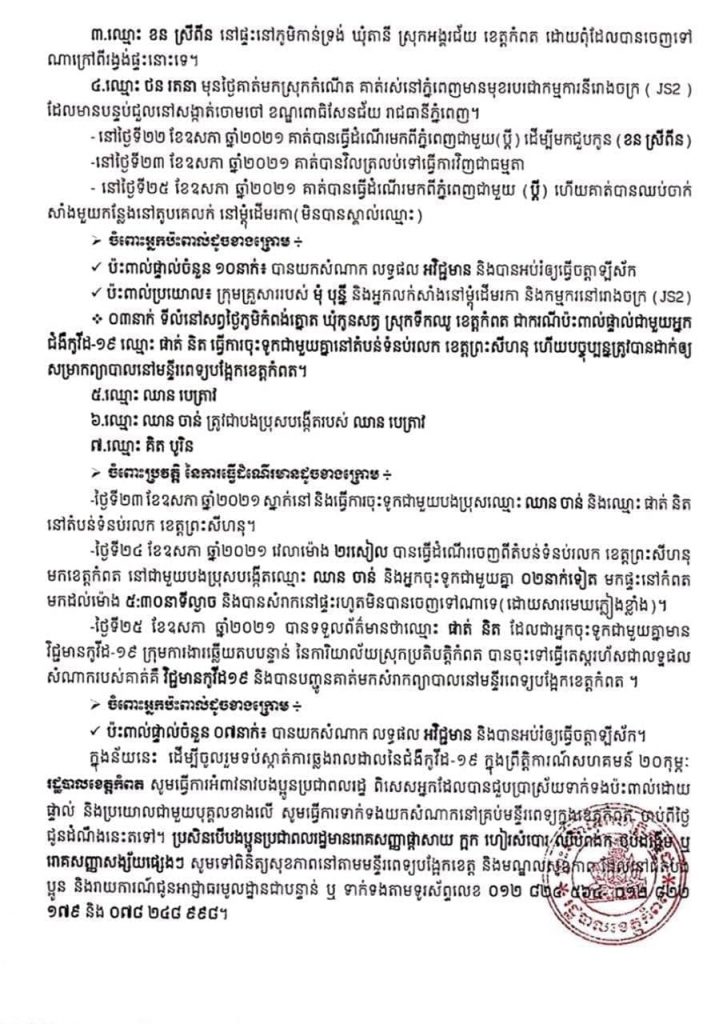 ជាមួយគ្នានោះ ដ្ឋបាលខេត្តកំពតបានស្រាវជ្រាវរកឃើញអ្នកពាក់ពន្ធ័១៧នាក់ ដែលបានប៉ះពាល់ផ្ទាល់ជាមួយអ្នកវិជ្ជមានកូវីដ-១៩ទាំង៧នាក់នោះ។ រដ្ឋបាលខេត្តកំពត បានអំពាវនាវដល់អ្នកផ្សេងទៀត ដែលមានពាក់ពន្ធ័ ឬដឹងខ្លួនថាបានប៉ះពាល់ដោយផ្ទាល់ ឬដោយប្រយោលជាមួយអ្នកវិជ្ជមានកូវីដ-១៩ទាំងនោះ ត្រូវធ្វើចត្តាឡីស័កនៅតាមផ្ទះរយៈពេល១៤ថ្ងៃ។ ប្រសិនបើមានបញ្ហាសុខភាពប្រែប្រួល ត្រូវផ្ដល់ព័ត៌មានទៅអាជ្ញាធរមូលដ្ឋាន និងប្រញាប់ទៅធ្វើតេស្ដនៅមន្ទីរពេទ្យបង្អែកជាបន្ទាន់។