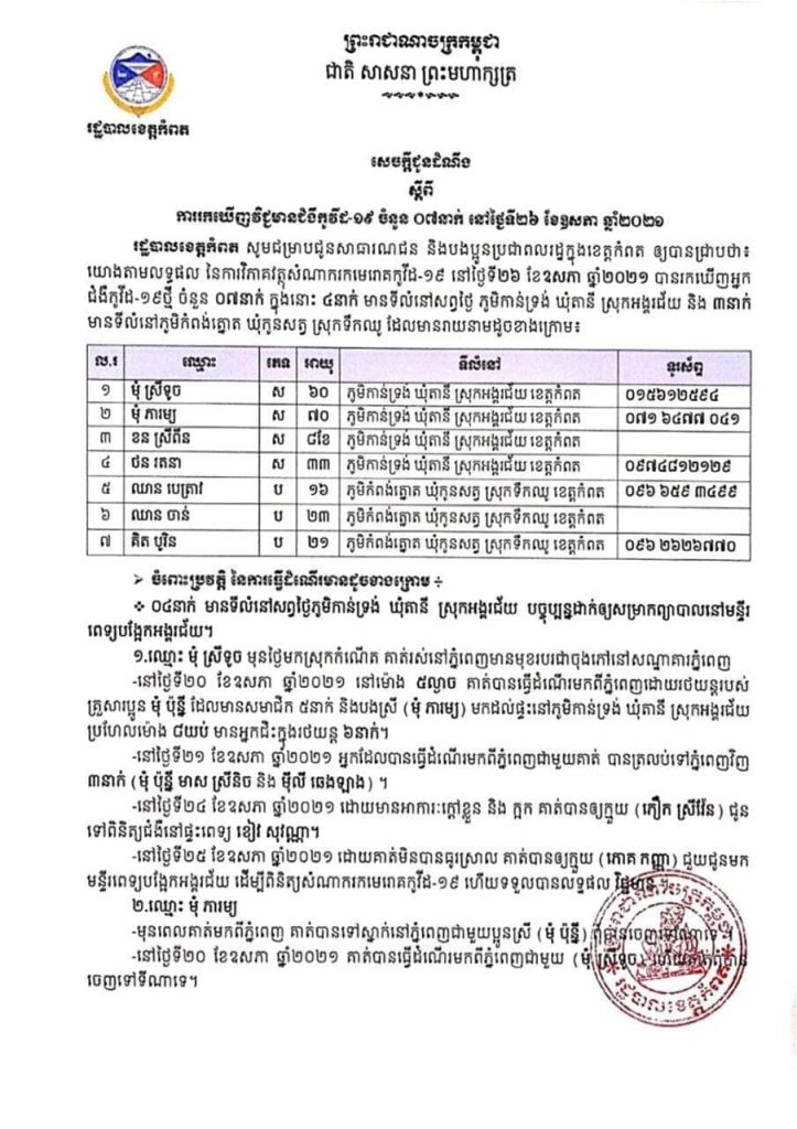 ខេត្តកំពត រកឃើញអ្នកវិជ្ជមានកូវីដ-១៩ ចំនួន ៧នាក់ក្នុងរយៈពេល ២៤ម៉ោងចុងក្រោយ