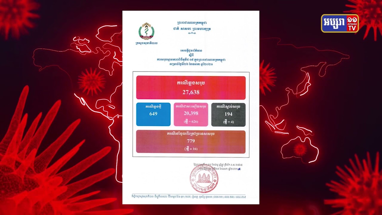 កម្ពុជាគិតត្រឹមថ្ងៃទី២៧ខែឧសភា ឆ្នាំ២០២១នេះមានការឆ្លងសរុបទូទាំងប្រទេសចំនួន២ម៉ឺន៧ពាន់៦៣៨នាក់, ការស្លាប់សរុបមានចំនួន១៩៤នាក់ក្រោយការស្លាប់ថ្មីចំនួន៣ក្នុងរយៈពេល២៤កន្លងមកនេះ , និងការព្យាបាល ជាសះស្បើយសរុបមានចំនួន២ម៉ឺន៣៩៨នាក់ក្រោយការព្យាបាលជាសះស្បើយចុងក្រោយនេះចំនួន៦២៦នាក់។
