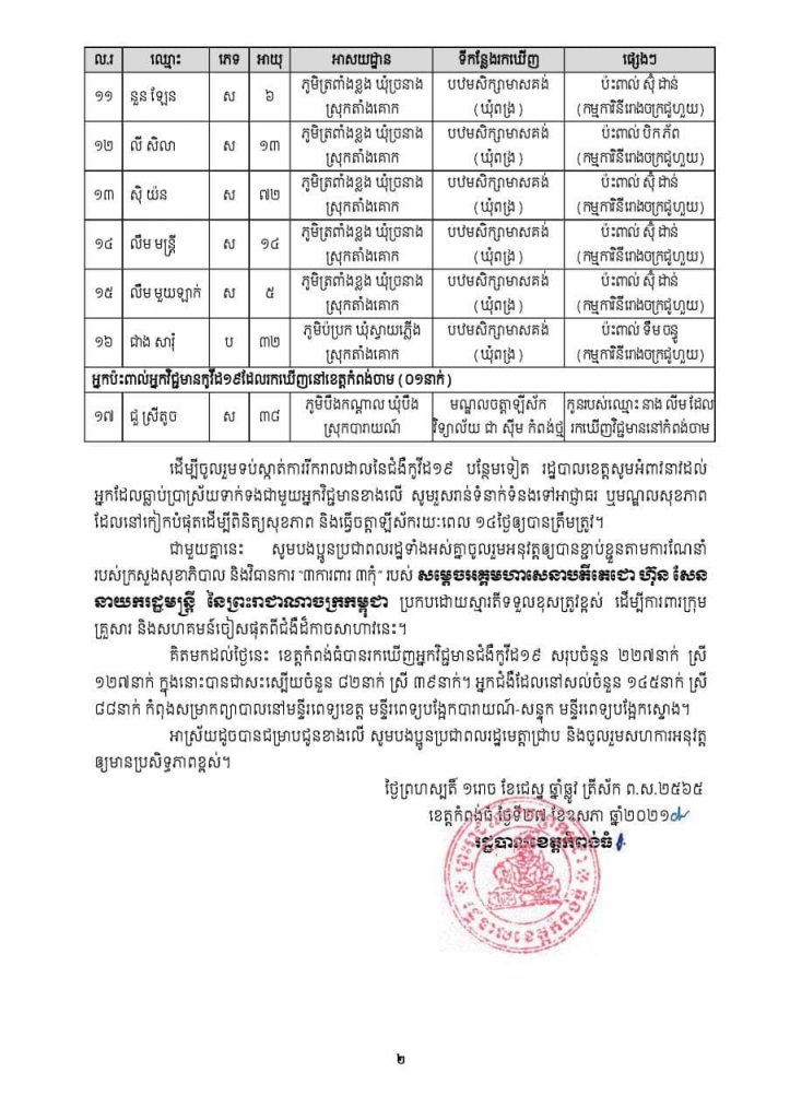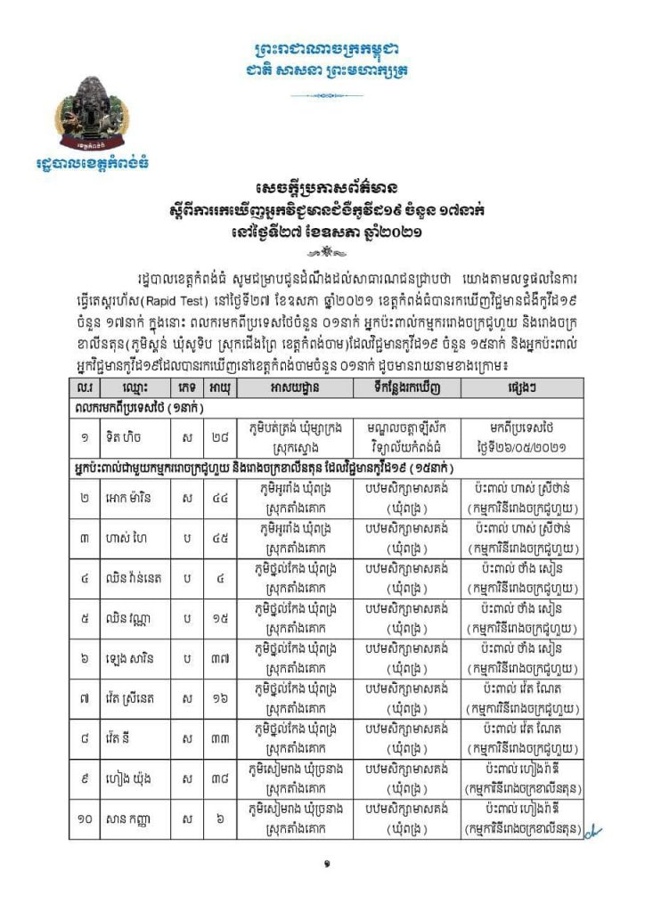 អត្តសញ្ញាណអ្នកវិជ្ជមានកូវីដ១៩ចំនួន ១៧នាក់ នៅខេត្តកំពង់ធំOne-Minuteអត្ថបទដោយ៖AMS OneMinute អ្នកឆ្លងសរុប ២២៧នាក់ជាសះស្បើយសរុប ៨២នាក់ ២៧ ឧសភា ២០២១ AMS OneMinuteអត្ថបទមុនអត្ថបទបន្ទាប់