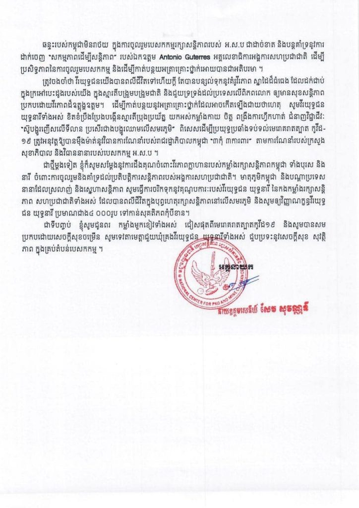នាយឧត្តមសេនីយ៍ សែម សុវណ្ណនី បានបន្តទៀថា ត្រូវចងចាំថា វីរយុទ្ធជនយើងបានពលីជីវិតទៅហើយក្ដី តែបានបន្សល់ទុកនូវគំរូវីរភាព ស្នាដៃដ៏ធំធេង ដែលដក់ជាប់ ក្នុងក្រអៅបេះដូងរបស់យើង ក្នុងស្មារតីបង្រួមបង្រួមជាតិ និងជួយទ្រទ្រង់ដល់ប្រទេសលើពិភពលោក ឱ្យមានសុខសន្តិភាព ប្រកបដោយវីរភាពដ៏ឧត្តុង្គឧត្តម ដើម្បីកាត់បន្ថយនូវអត្រាគ្រោះថ្នាក់ដែលអាចកើតឡើងជាយថាហេតុ។ សូមវីរយុទ្ធជន យុទ្ធនារីទាំងអស់ ខិតខំប្រឹងប្រែងបង្កើនស្មារតីប្រុងប្រយ័ត្ន យកអស់កម្លាំងកាយចិត្ត ពង្រឹងការហ្វឹកហាត់ជំនាញវិជ្ជាជីវៈ “ស៊ូបង្ហូរញើសលើទីលាន ប្រសើរជាងបង្ហូរឈាមលើសមរភូមិ ពិសេសដើម្បីប្រយុទ្ធប្រឆាំងទប់ទល់មេរោគរាតត្បាតកូវីដ-១៩ ត្រូវអនុវត្តឱ្យបានម៉ឺងម៉ាត់នូវវិធានការណែនាំរបស់រាជរដ្ឋាភិបាលកម្ពុជា “៣កុំ ៣ការពារ” តាមការណែនាំរបស់ក្រសួងសុខាភិបាល និងវិធាននានារបស់បេសកកម្ម អ.សប៕