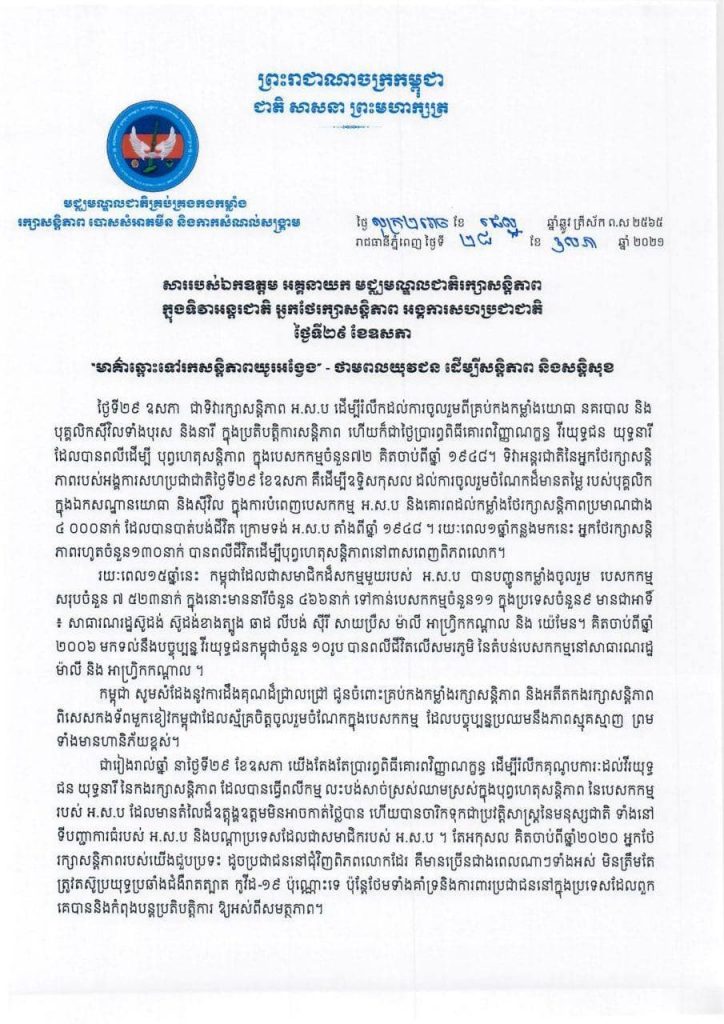 ឯកឧត្តមបន្តទៀថា ជារៀងរាល់ឆ្នាំ នាថ្ងៃទី២៩ ខែឧសភា យើងតែងតែប្រារព្ធពិធីគោរពវិញ្ញាណក្ខន្ធដើម្បីរំលឹកគុណូបការៈដល់វីរយុទ្ធជន យុទ្ធនារី នៃកងរក្សាសន្តិភាព ដែលបានធ្វើពលីកម្ម លះបង់សាច់ស្រស់ឈាមស្រស់ក្នុងបុព្វហេតុសន្តិភាពនៃបេសកកម្មរបស់អ.ស.ប ដែលមានតម្លៃដ៏ឧត្តុង្គឧត្តមមិនអាចកាត់ថ្លៃបាន ហើយបានចារឹកទុកជាប្រវត្តិសាស្ត្រនៃមនុស្សជាតិ ទាំងនៅទីបញ្ហាការធំរបស់ អ.ស.ប និងបណ្តាប្រទេសដែលជាសមាជិករបស់ អ.ស.ប។