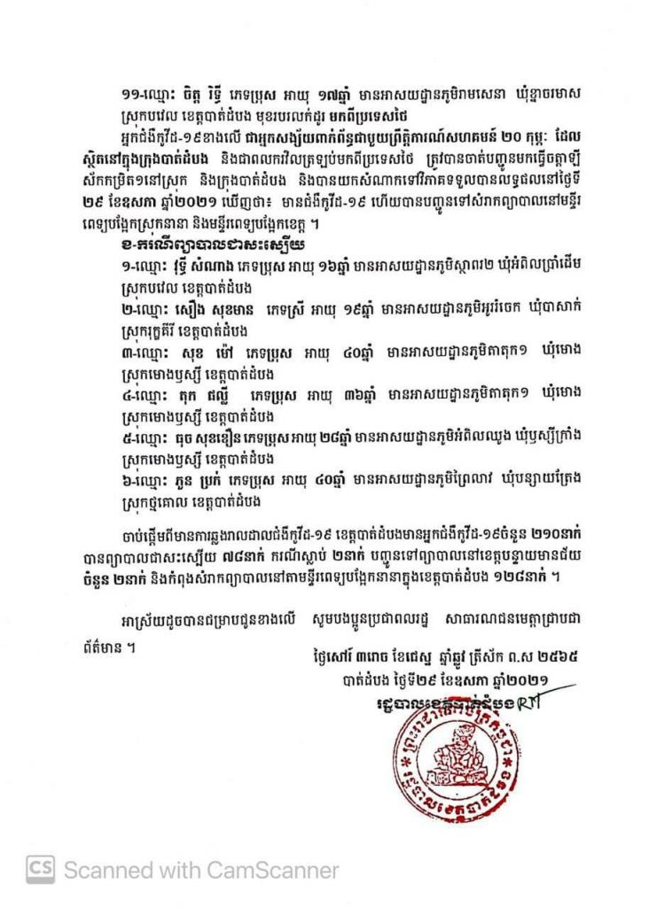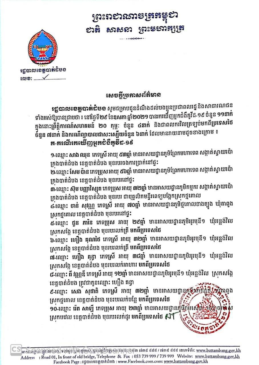 រដ្ឋបាលខេត្តបាត់ដំបង បានចេញសេចក្តីប្រកាសព័ត៌មាន និង ជូនដំណឹង នៅល្ងាច ថ្ងៃទី២៩ ខែឧសភាឆ្នាំ២០២១នេះ ពីករណីរកឃើញ វិជ្ជមានជម្ងឺកូវីដ-19 ចំនួន១១នាក់ ថ្មីបន្ថែមទៀត ក្នុងនោះពាក់ព័ន្ធព្រឹត្តិការណ៍សហគមន៍២០កុម្ភៈចំនួន០៤នាក់និង ជាពលករវិលត្រឡប់ពីប្រទេសថៃ ចំនួន០៧នាក់ និងបានព្យាបាលអ្នកជម្ងឺ ឲ្យជាសះស្បើយ ចំនួន០៦នាក់ ត្រូវបានអនុញ្ញាតិឲ្យវិលត្រឡប់ទៅលំនៅដ្ឋានរបស់ខ្លួនវិញផងដែរ។
